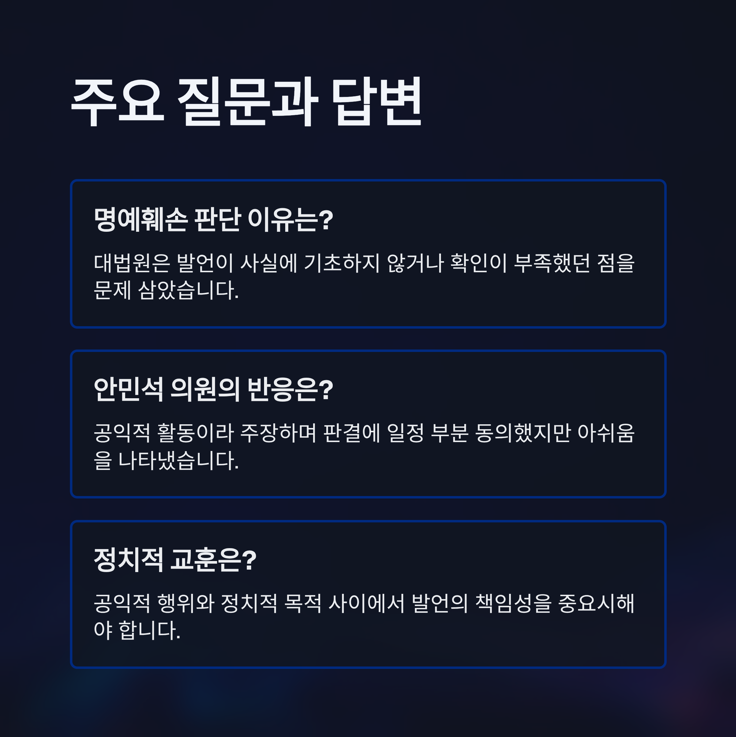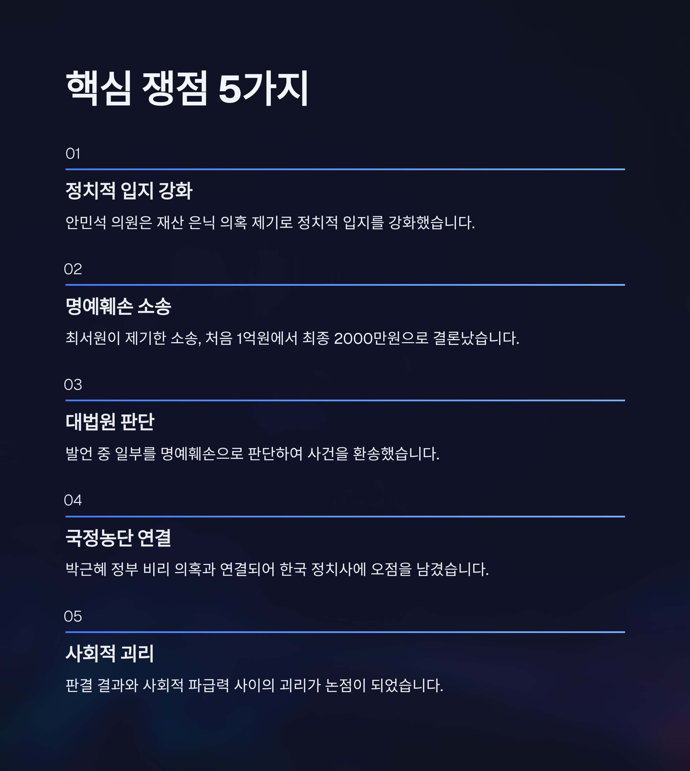 3. 대법원은 안민석의 발언 중 일부를 명예훼손으로 판단하여 사건을 환송했고, 이는 사회적 논란을 더욱 키웠습니다.