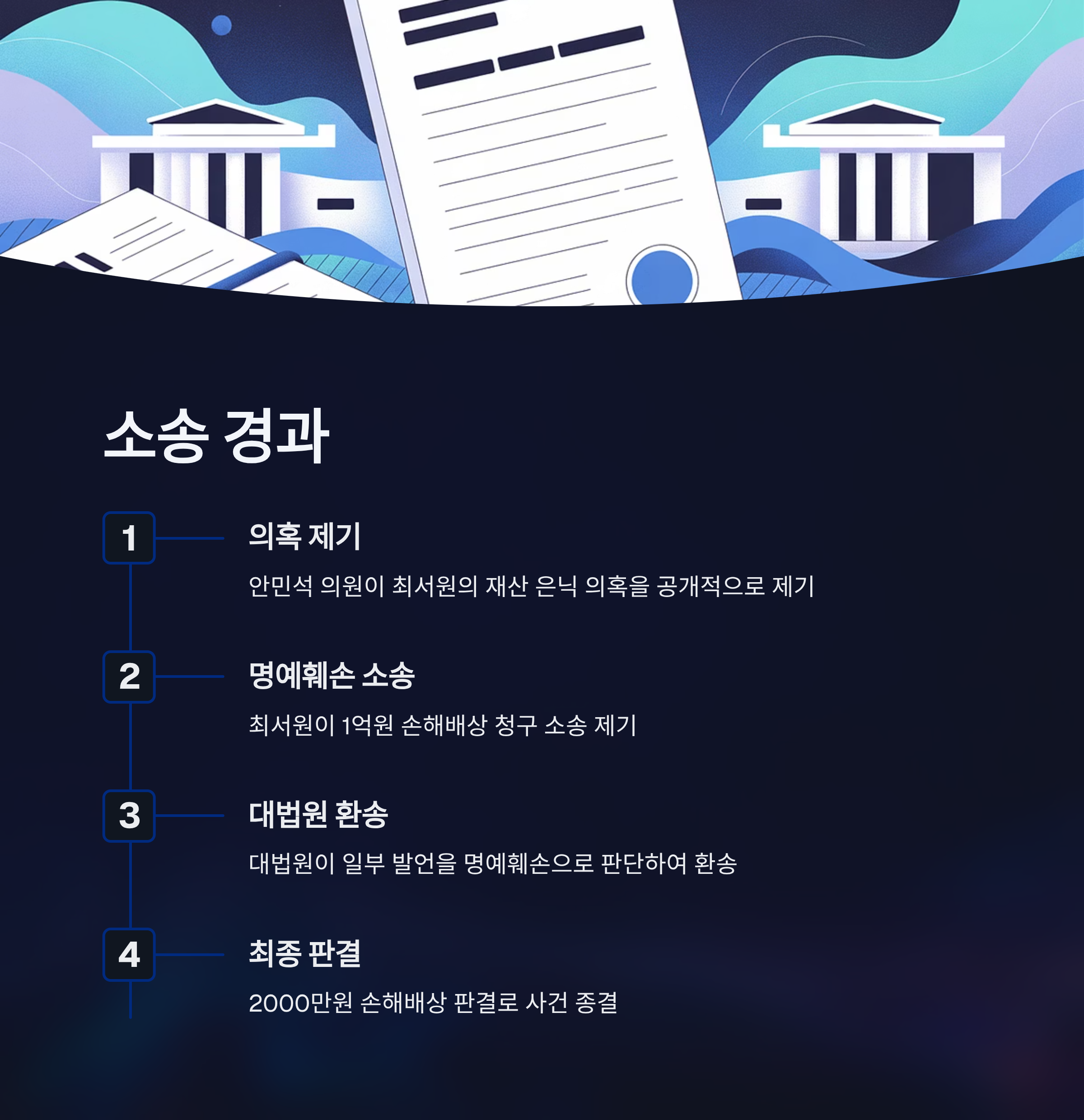 안민석 국회의원이 제기한 최서원의 재산 은닉 의혹은 한동안 우리 사회의 뜨거운 이슈 중 하나였습니다. 박근혜 정부의 국정농단 사건이 온 사회를 뒤흔든 가운데, 당시 최서원의 숨겨진 재산 문제가 수면 위로 떠올랐습니다. 안 의원은 이를 명분으로 유럽까지 방문하며 많은 의혹을 제기했지만, 결국 명예훼손으로 대법원까지 다투는 결과를 낳았죠. 최근 최종적으로 2000만 원 손해배상 판결이 나왔지만, 금액에 비해 정치적, 사회적 여파는 상당히 컸습니다. 오늘은 이 사건의 배경, 소송 과정, 그리고 그 의미를 철저히 분석하며 이에 대해 깊이 있는 논의를 해보겠습니다.
