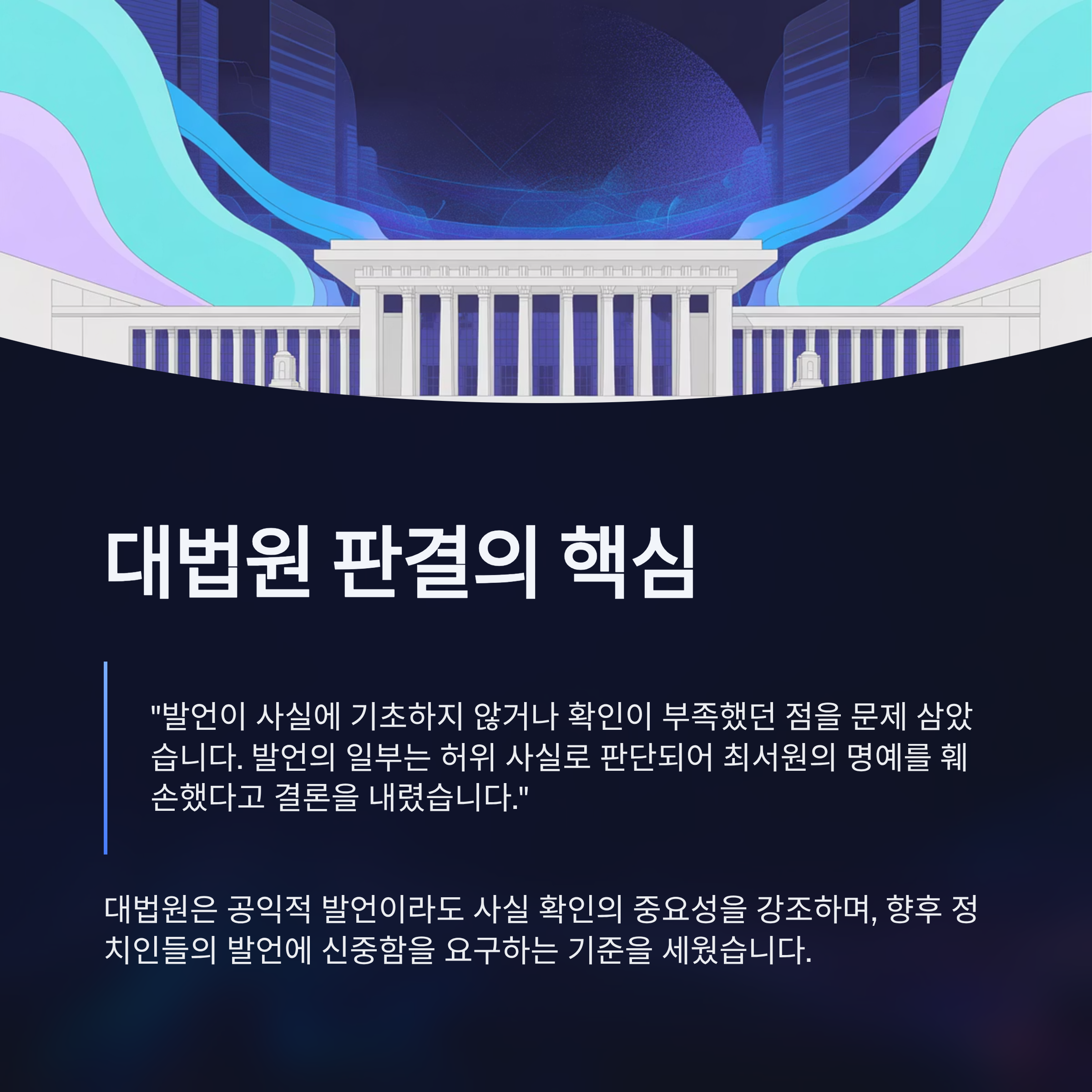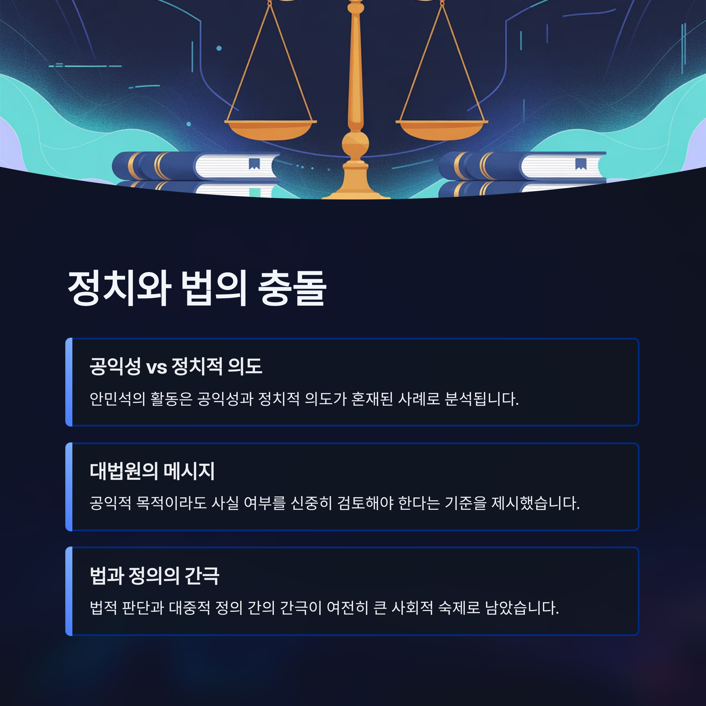 안민석의 활동은 공익성과 정치적 의도가 혼재된 사례로 분석됩니다. 대법원의 판결은 정치인이 공익적 목적으로 발언했더라도, 사실 여부를 신중히 검토하지 않으면 법적으로 문제 소지가 있다는 것을 강조했습니다. 이는 향후 공익적 발언을 내세우는 정치인들에게 신중함을 요구하는 기준으로 작용할 수 있습니다. 그러나 법적 판단과 대중적 정의 간의 간극이 여전히 큰 사회적 숙제로 남아 있습니다.