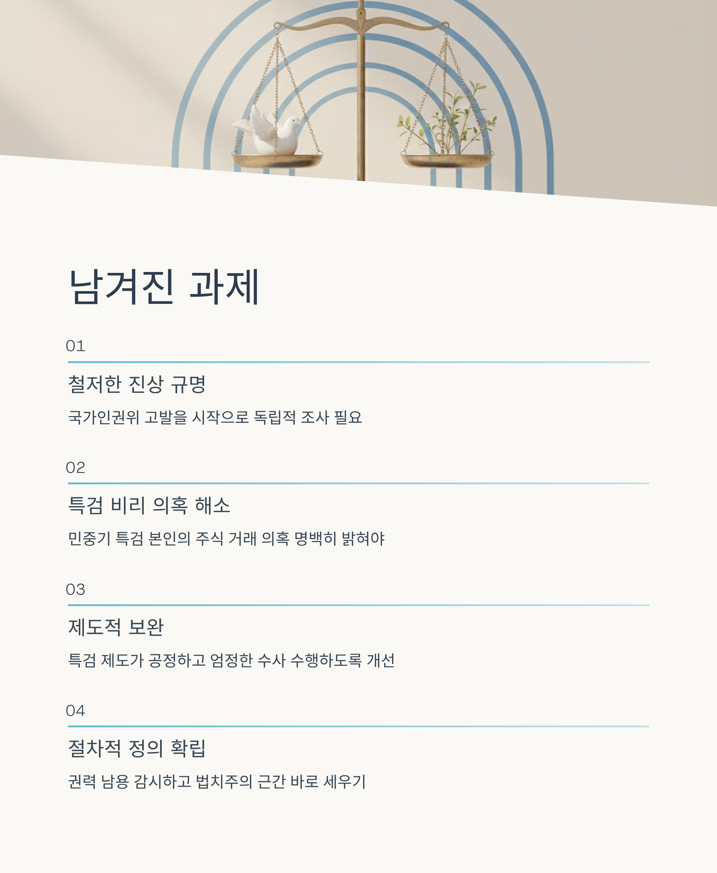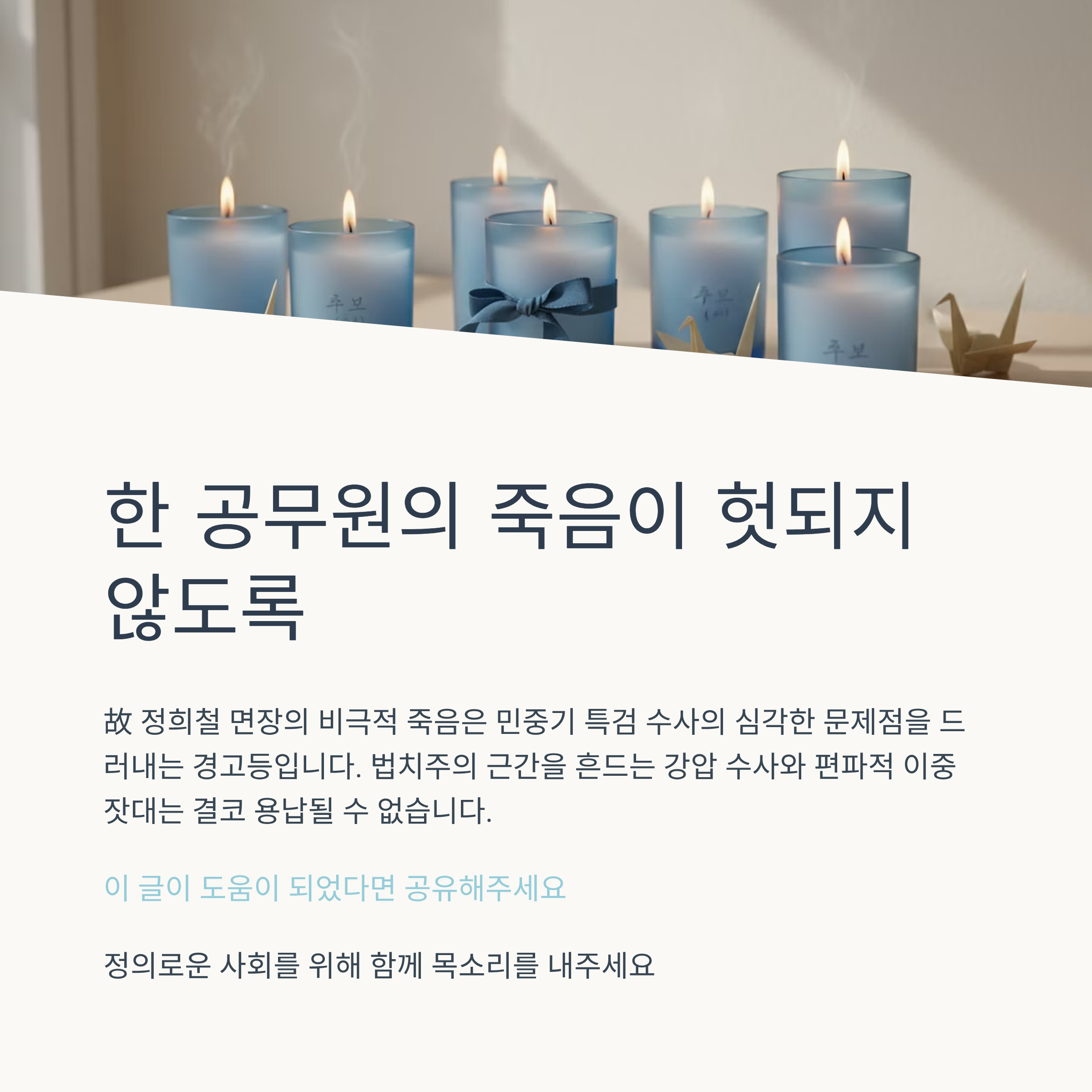 한 공무원의 안타까운 죽음이 헛되지 않도록, 우리 사회가 권력의 남용을 감시하고 절차적 정의를 바로 세우는 계기로 삼아야 할 것입니다.