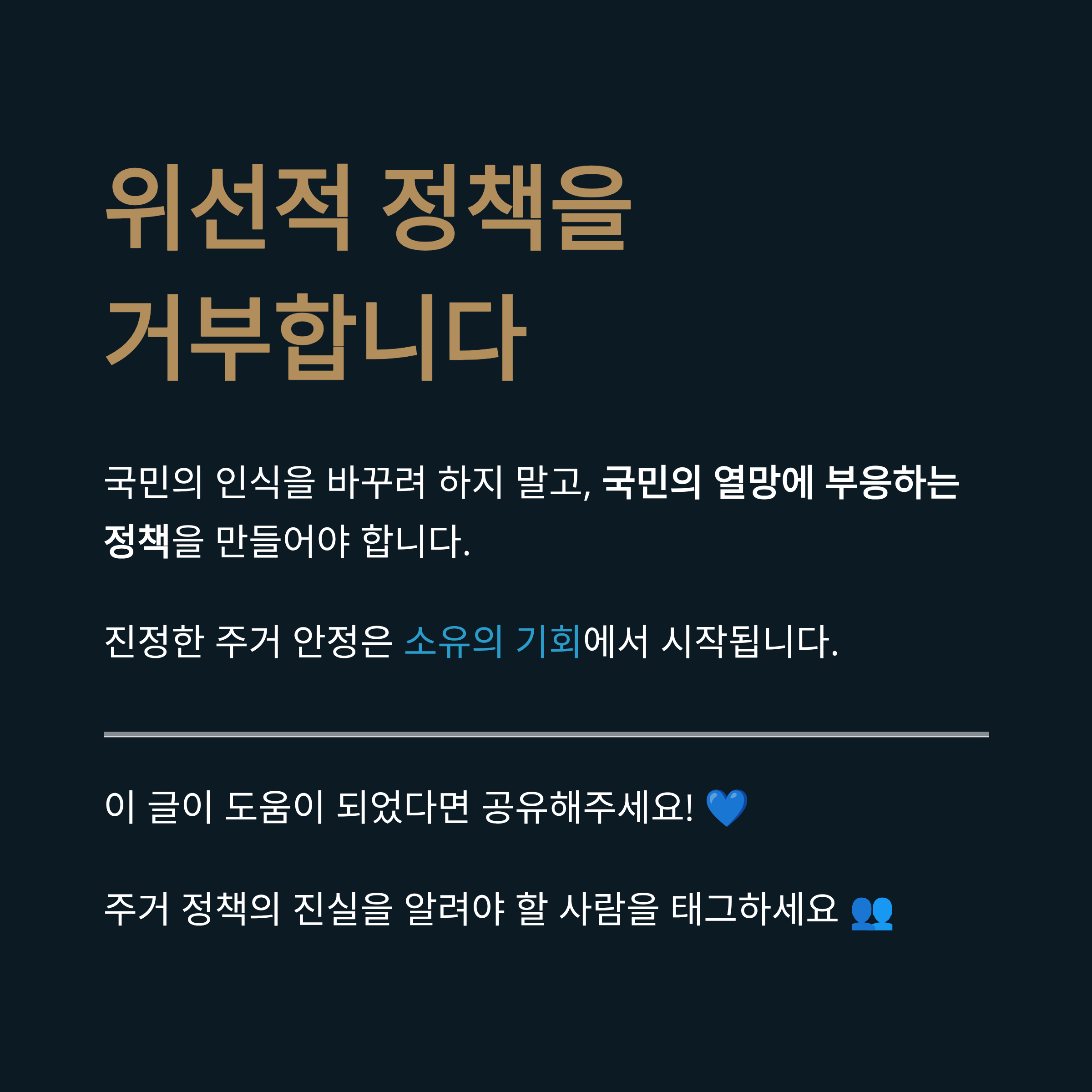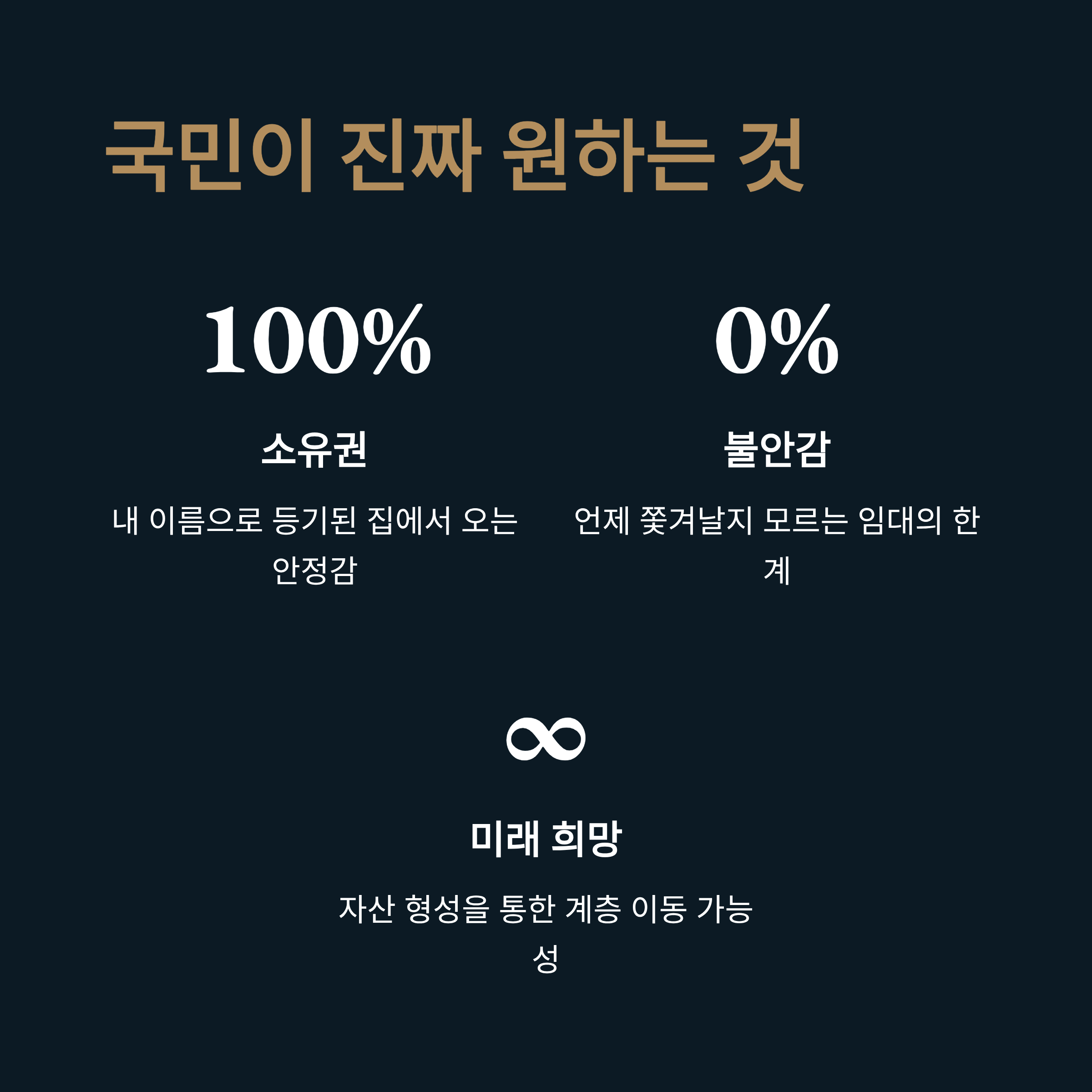 국민이 원하는 것은 더 좋은 위치의 임대 아파트가 아니라, 나의 노력으로 얻을 수 있는 '내 집'이라는 안정된 자산이자 미래입니다.