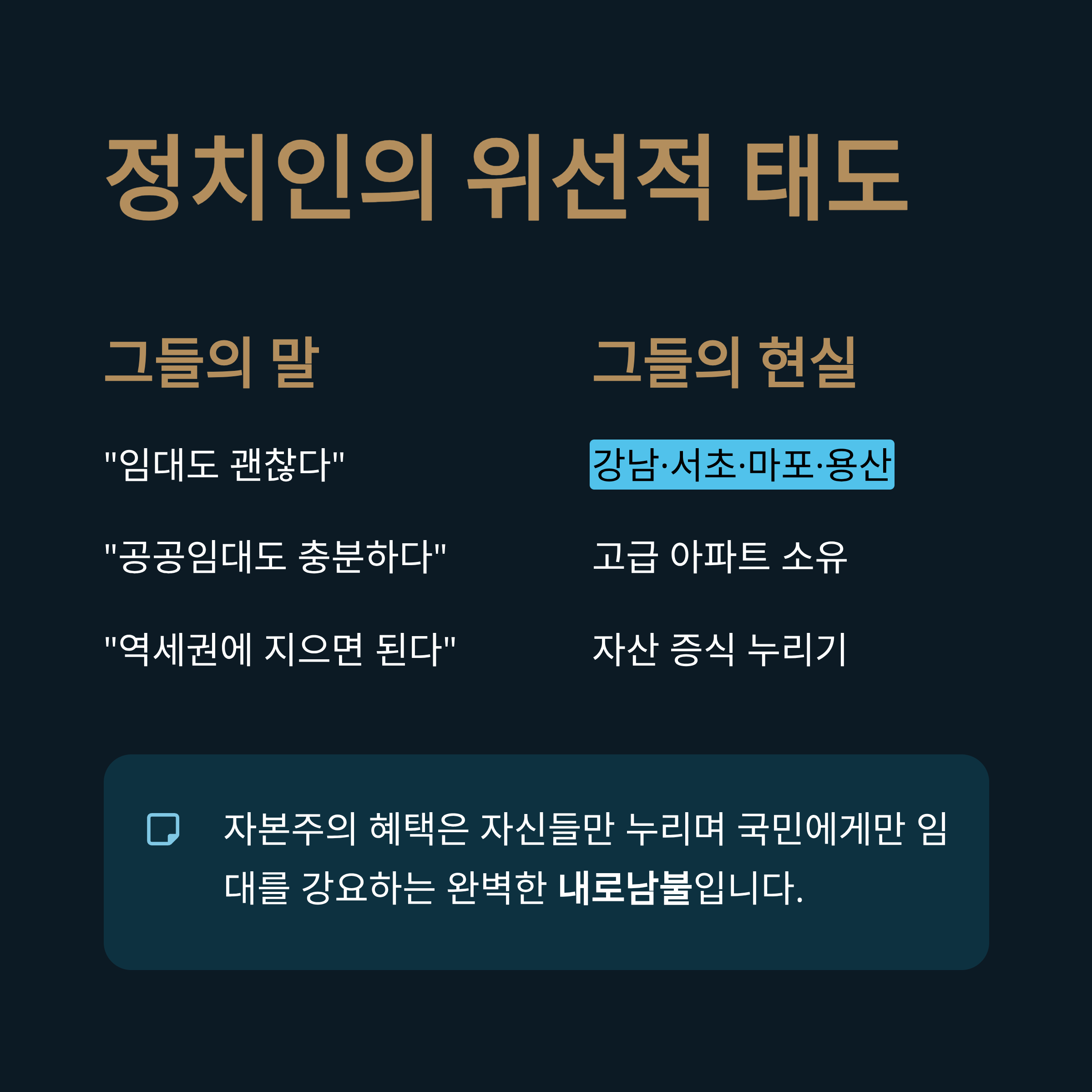 자본주의와 자유시장 경제의 모든 혜택을 누리며 자산을 증식하는 그들이, 유독 국민에게만 그 길을 가지 말고 임대에 머물라고 말하는 것은 완벽한 '내로남불'입니다.