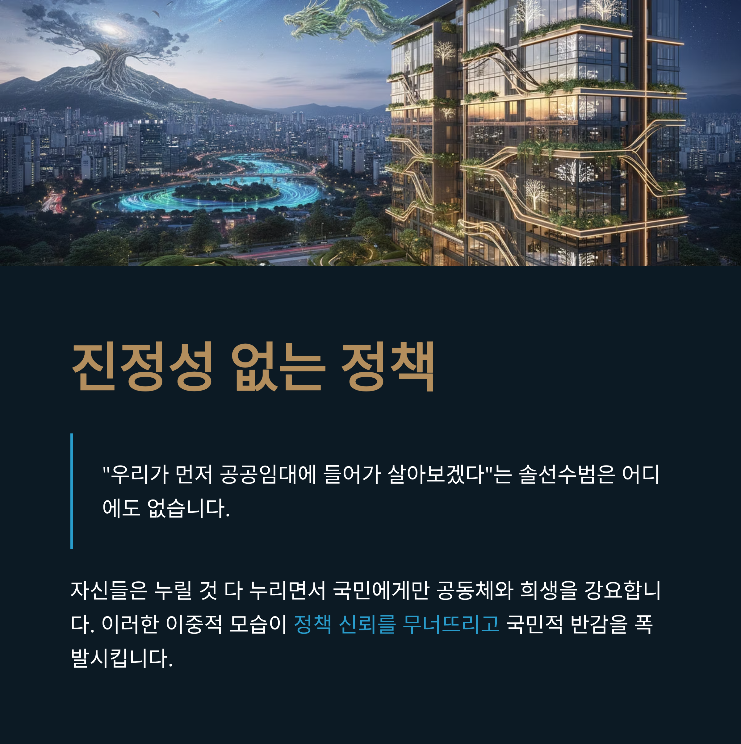 | 정책을 추진하는 정치인들 다수가 정작 본인들은 강남 등 고가 주택을 소유하고 있으면서 국민에게만 임대 주택을 권하는 '내로남불' 태도를 보이기 때문입니다. 이러한 위선적인 모습이 정책에 대한 불신과 분노를 키웁니다. |