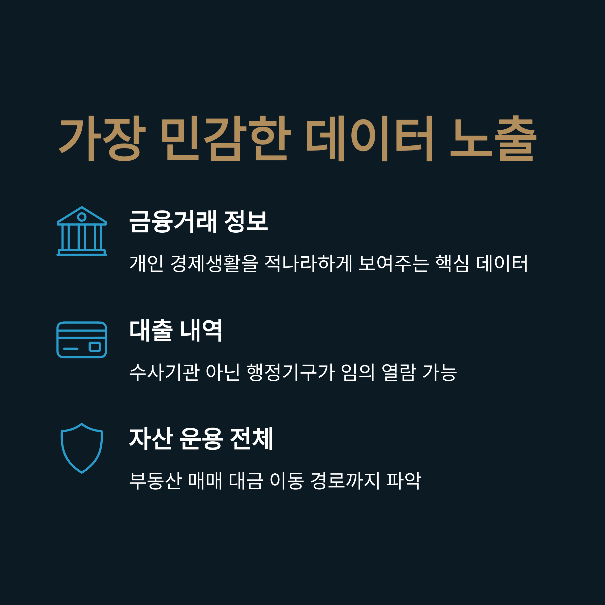 영장 없는 금융 정보 조회 권한은 법원 영장 없이 개인의 대출 정보, 계좌 이체 흐름 등 민감 정보를 포괄적으로 조회할 수 있게 합니다.