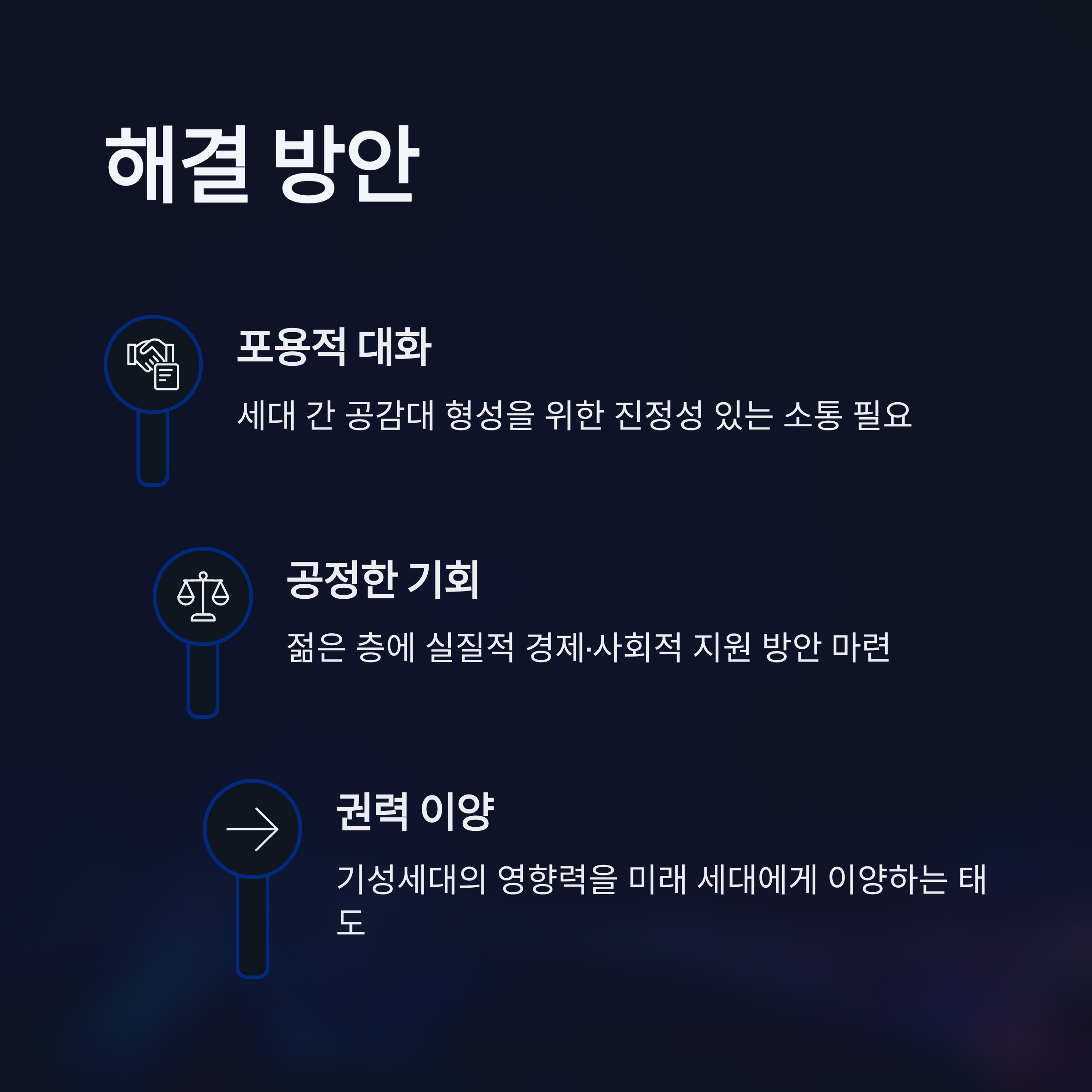 갈등 해결의 핵심은 공정한 기회 제공과 세대 간 포용적 대화입니다. 또한, 정책적으로는 젊은 층에 실제적인 도움을 줄 수 있는 경제적·사회적 지원 방안이 필요하며, 기성세대가 자신들의 영향력을 미래 세대에게 이양하려는 태도가 요구됩니다. 이러한 노력 없이 갈등은 지속될 수밖에 없습니다.