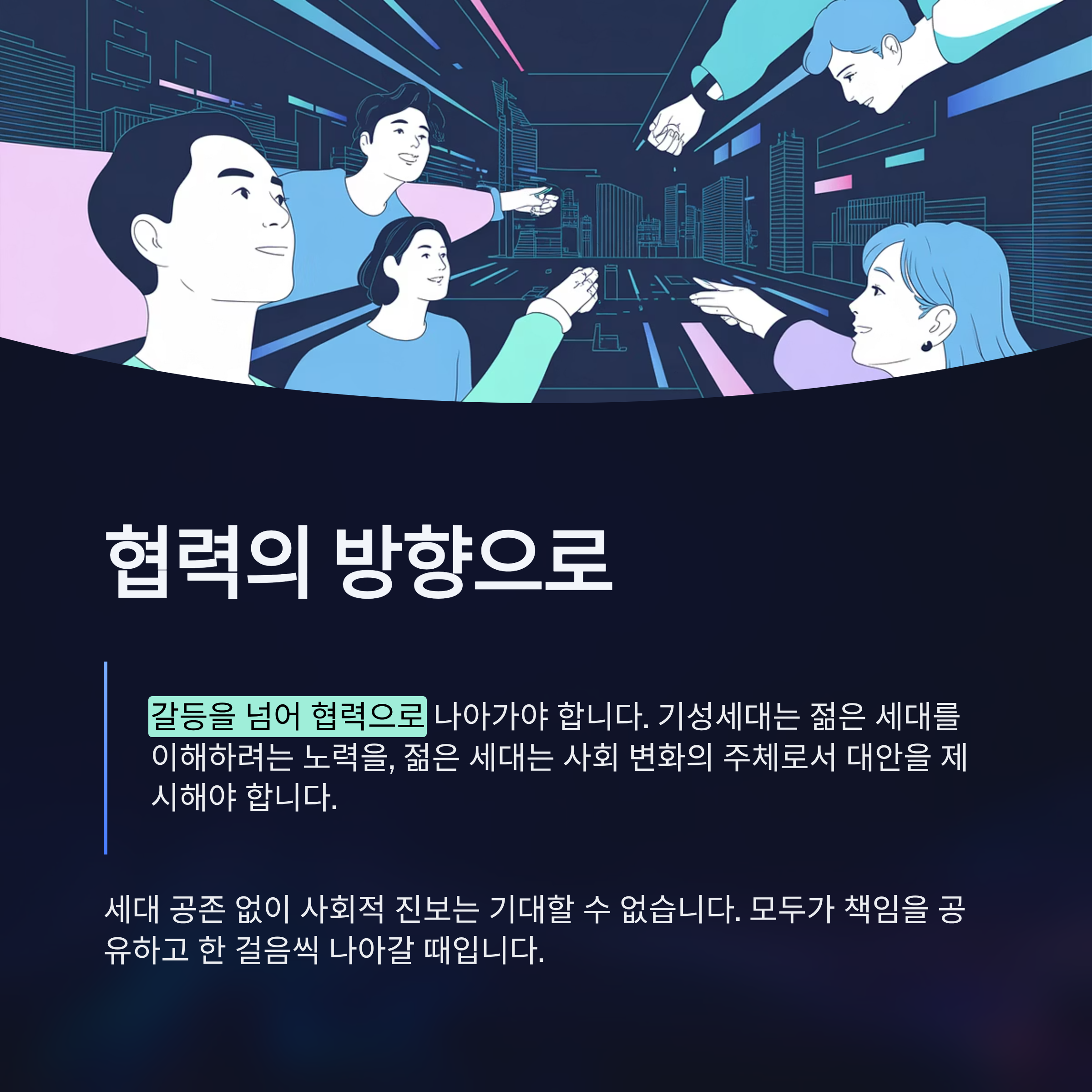 이제는 갈등을 넘어서 협력의 방향으로 나아가야 합니다. 기성세대는 젊은 세대를 더 이해하려는 노력을 기울여야 하며, 젊은 세대는 비판을 넘어 사회 변화의 주체로서 대안을 제시할 필요가 있습니다. 정책적으로는 세대 간 불균형을 해소하기 위해 실질적인 지원과 기회의 재배분이 이뤄져야 합니다.