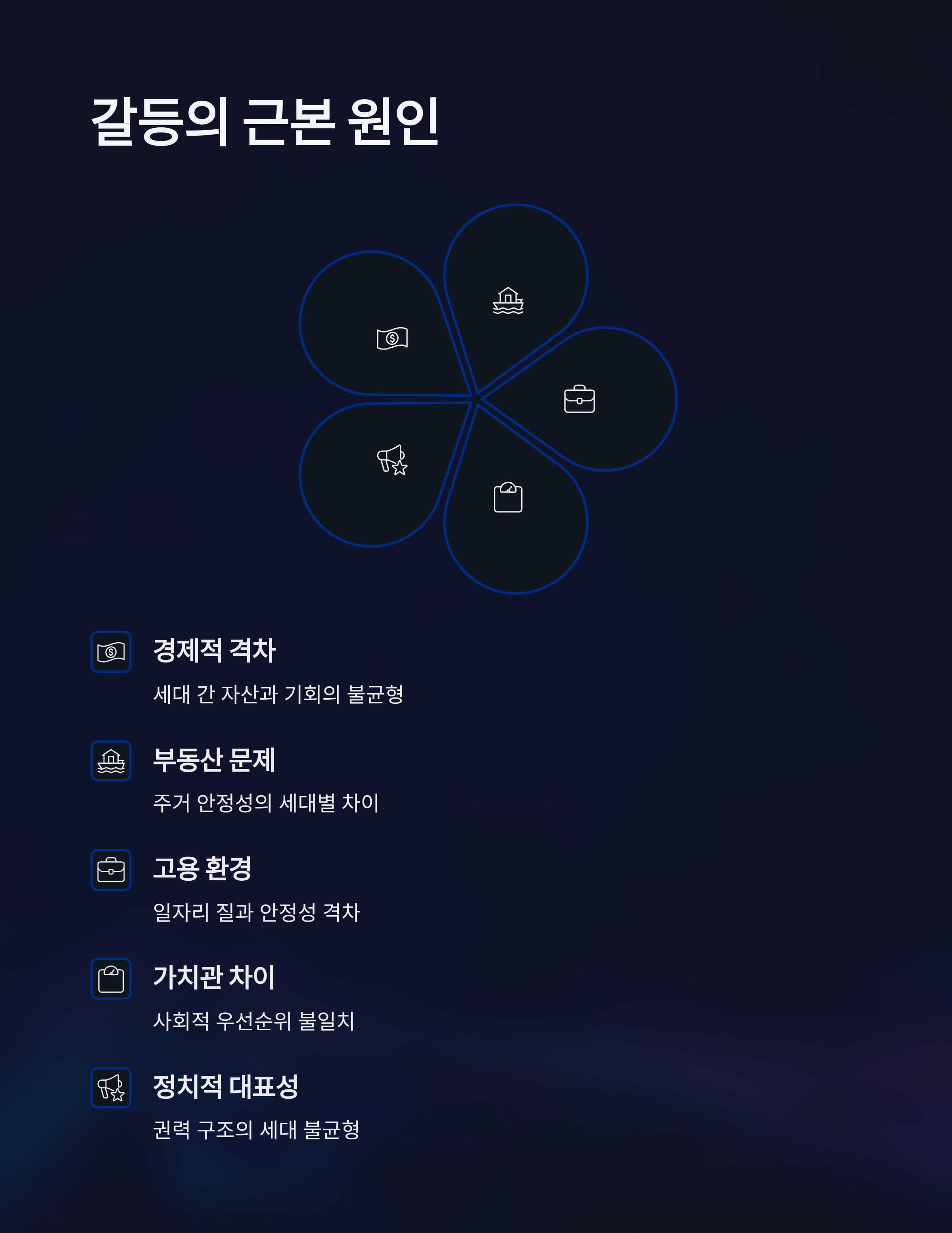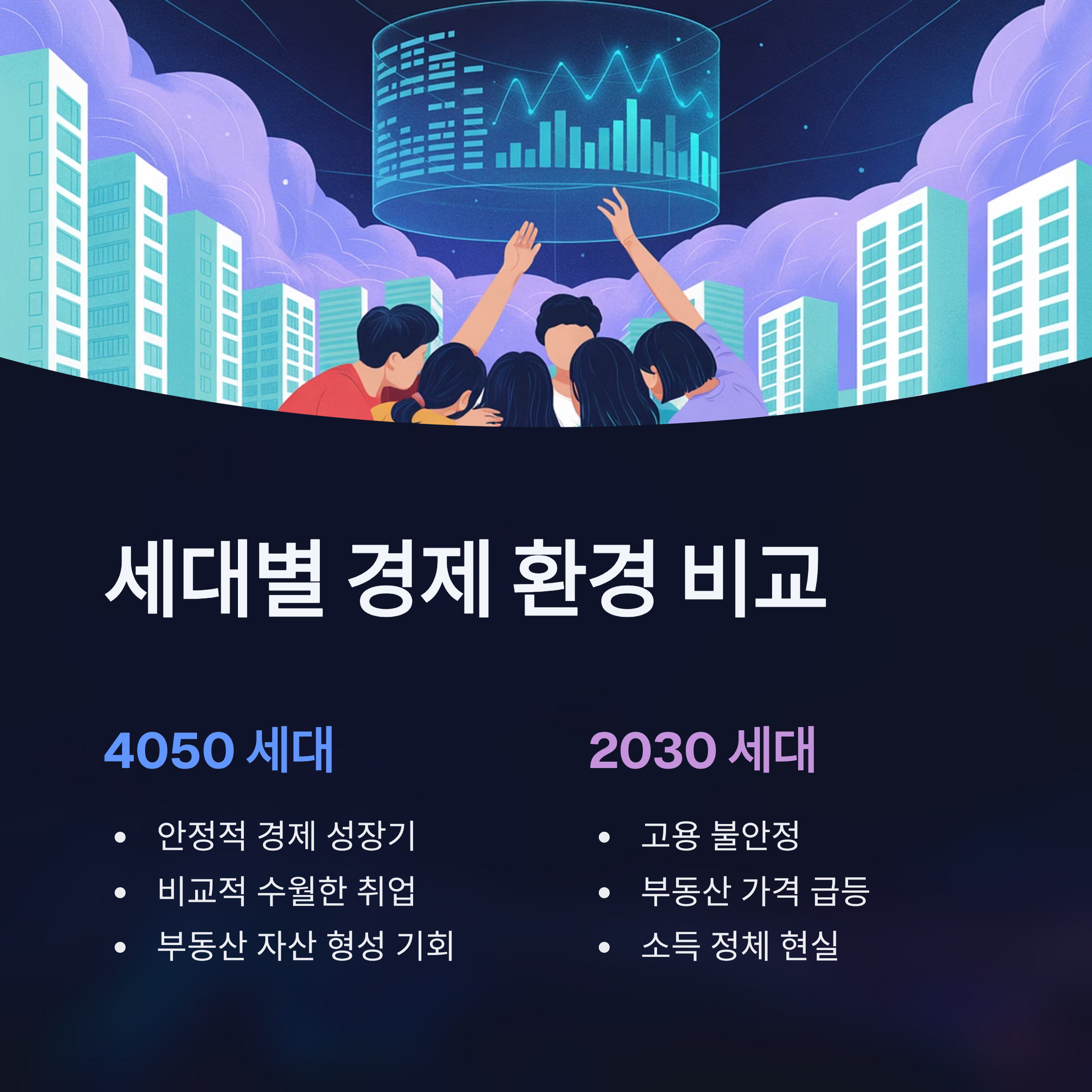 4050 세대와 2030 세대의 갈등은 단순히 세대 간의 견해 차이를 넘어, 현 경제적 환경과 사회적 가치 변화가 가져온 문제로 봐야 합니다. 기성세대는 비교적 안정적인 경제적 여건을 기반으로 성장했지만, 2030 세대는 고용 불안, 부동산 가격 상승, 소득 정체와 같은 현실에 직면해 있습니다. 이러한 차이는 세대 간 복지와 정책에 대한 시각차를 낳으며 갈등의 원천이 되고 있습니다.