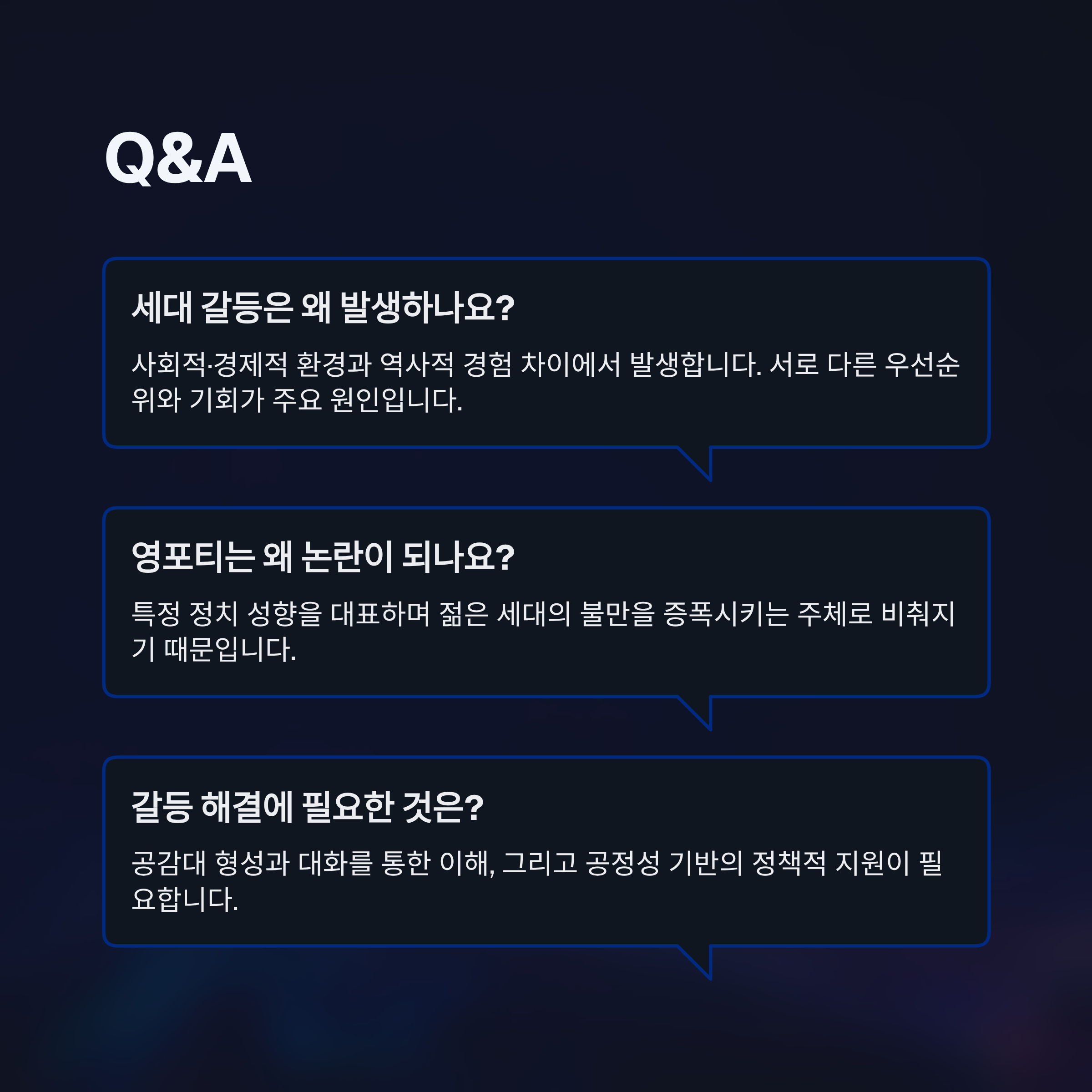 | A. 세대 갈등은 사회적, 경제적 환경과 역사적 경험 차이에서 발생합니다. 서로 다른 우선순위와 기회를 누린 배경이 주요 원인입니다. |