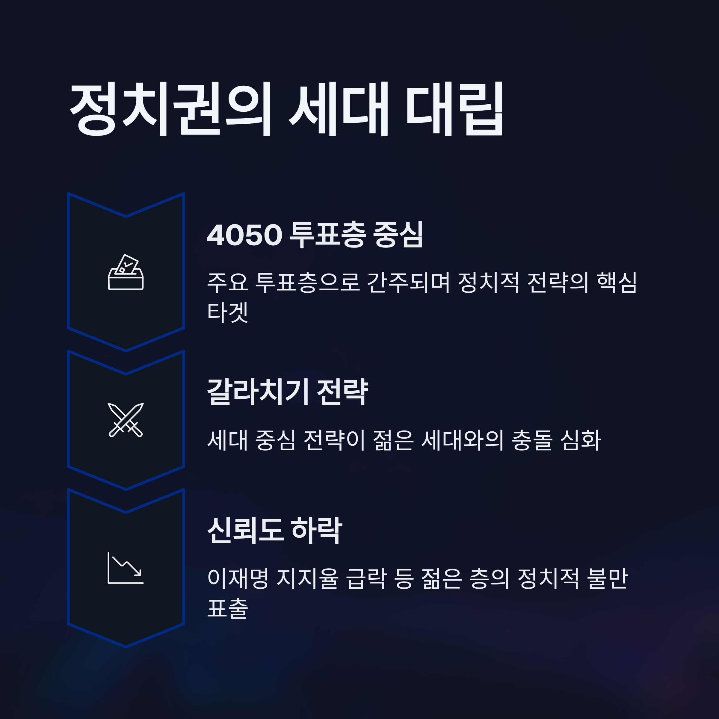 정치권은 지역, 영호남 대립, 젠더 갈등에 이어 세대 간의 갈등을 정치적 유불리로 이용하는 모습을 보이고 있습니다. 특히 4050 세대는 여전히 주요한 투표층으로 간주되며, 이들에게 어필하려는 전략이 자주 관찰됩니다. 하지만 이러한 세대 중심의 갈라치기 전략은 결국 젊은 세대와의 충돌을 심화시키고 있습니다.