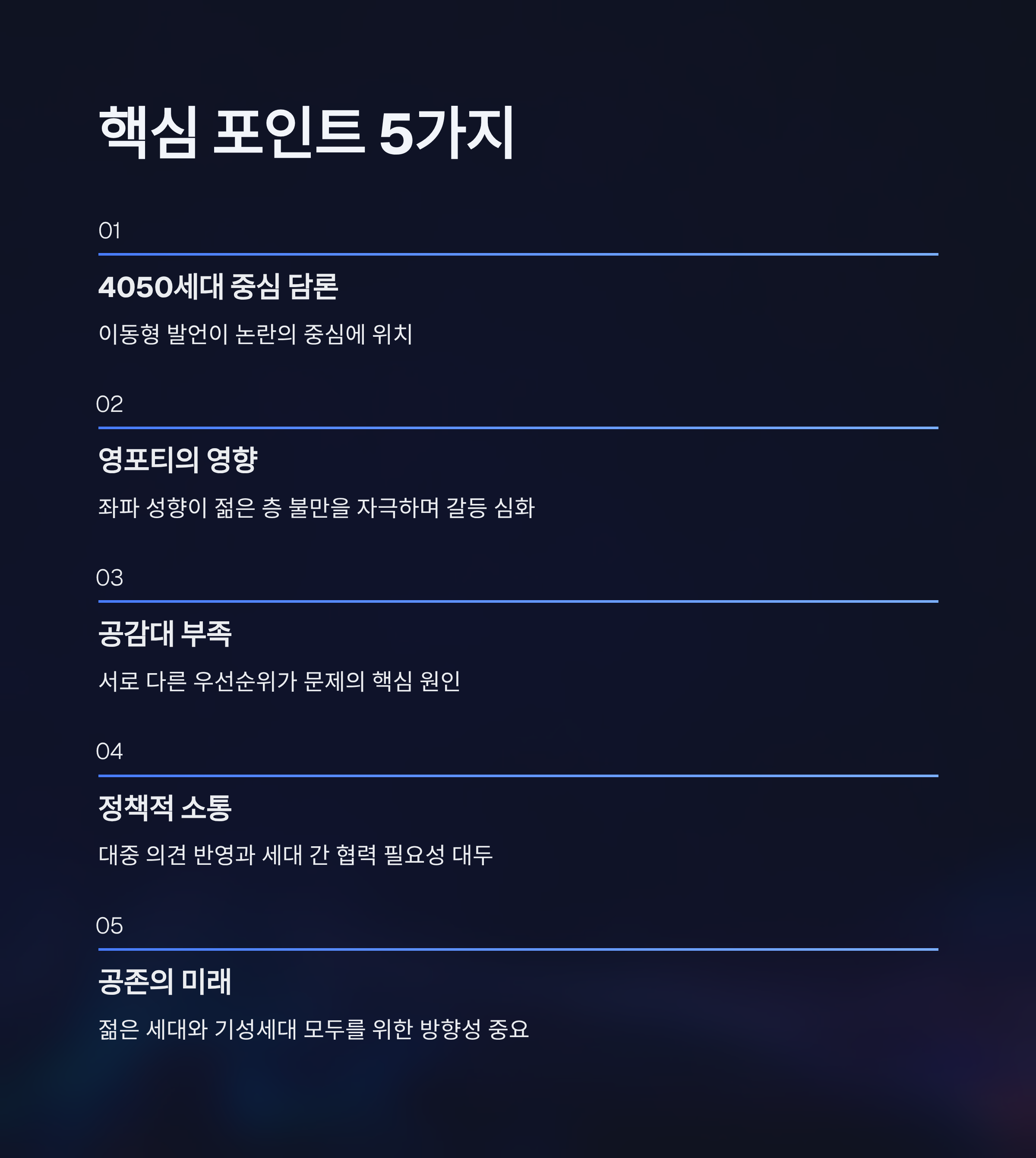 5. 젊은 세대와 기성세대 모두 공존 가능한 미래를 설계하는 방향성이 중요하다.