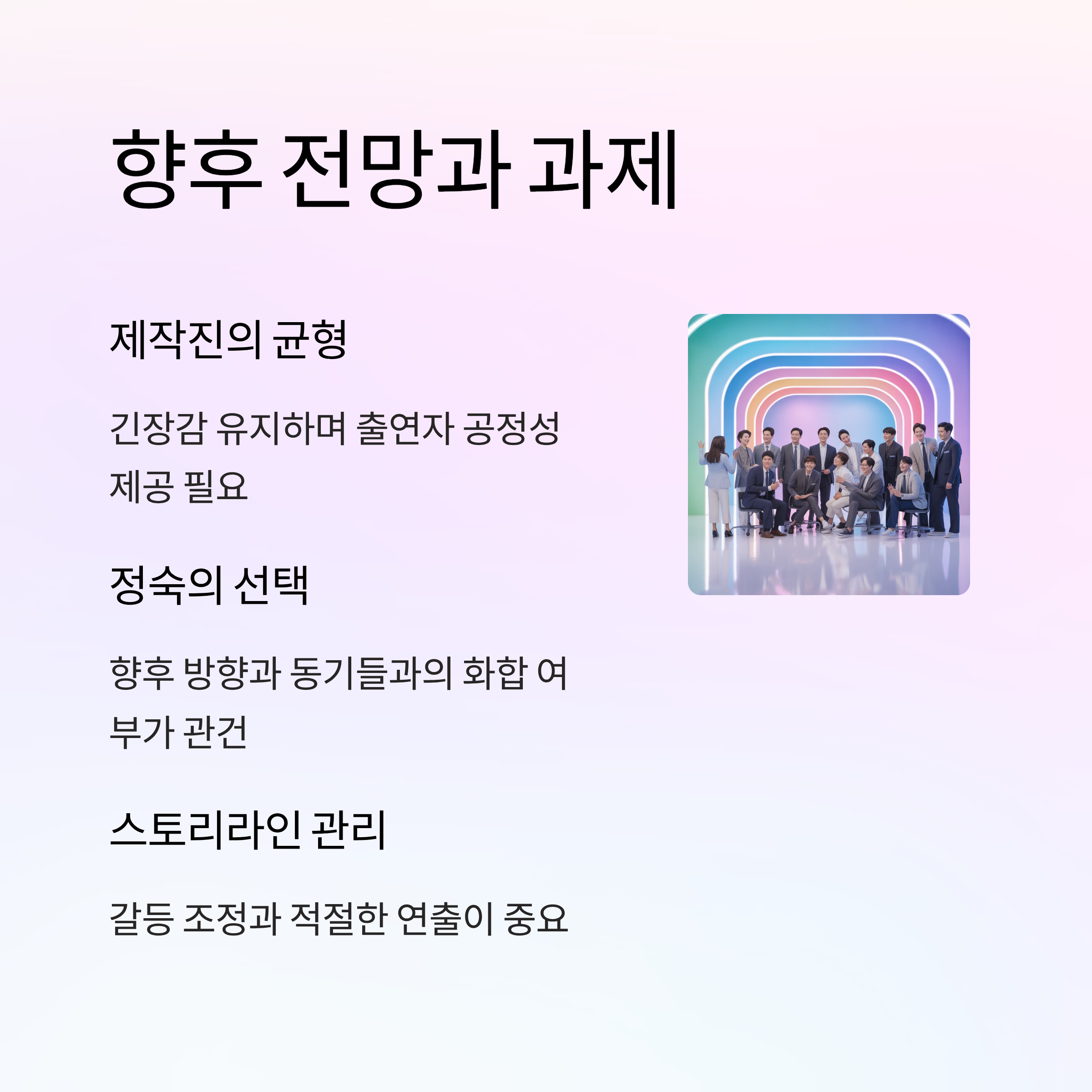 방송 외적으로 퍼진 임신설은 정숙을 더욱 이슈의 중심에 서게 했습니다. 공식적인 언급이 없기 때문에 시청자들의 호기심과 루머는 계속해서 확산되고 있습니다. 해당 루머는 프로그램의 인지도 상승과 정숙이라는 캐릭터에 대한 집중도를 증가시키는 효과를 가져왔지만, 장기적으로는 정숙 개인에게 부담으로 작용할 가능성도 있습니다. 이러한 이슈는 방송에서 다루지 않더라도 제작진의 후속 발표와 세부 픽업 포인트가 필요한 영역입니다.