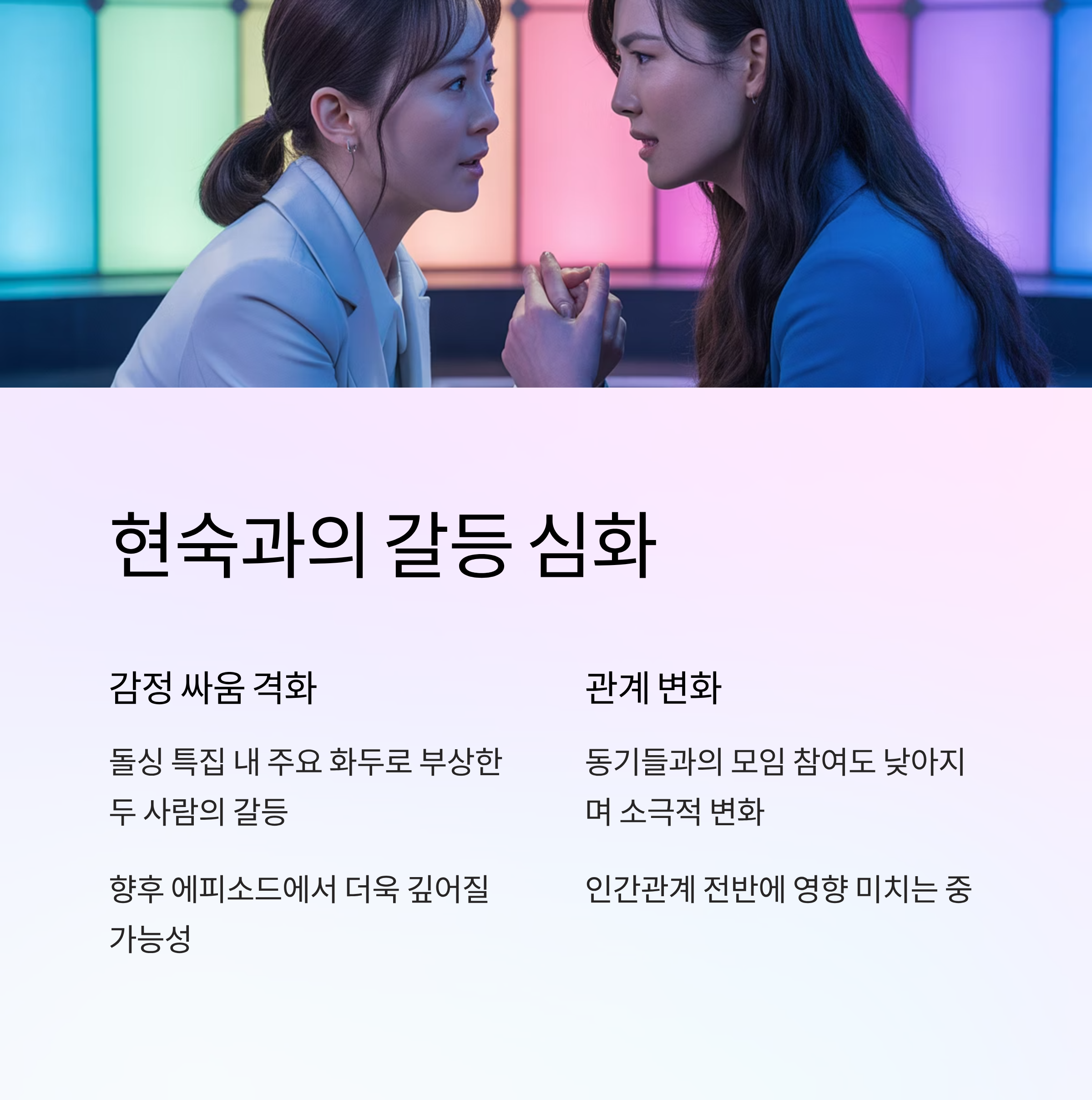 | A. 정숙과 현숙의 갈등은 향후 에피소드에서 추가로 깊어질 가능성이 있으며, 영수와 상철 간 선택 또한 큰 변화의 원인이 될 수 있습니다. |