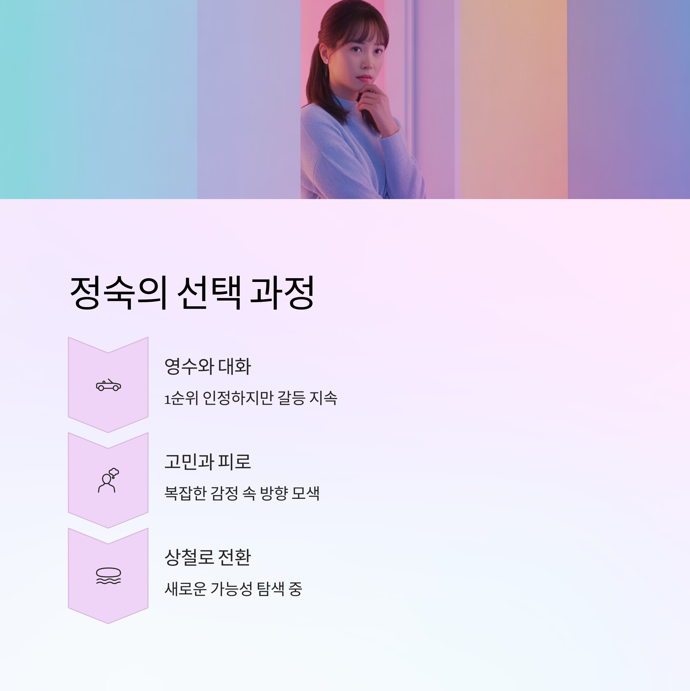 정숙은 영수와의 복잡한 관계 속에서 자신이 '항상 1순위'라는 영수의 말을 들으면서도 점점 피로와 갈등을 느끼며 다른 선택지를 모색하게 됩니다. 이로 인해 상철로의 급회전 및 새로운 데이트 성사가 그녀의 결정 과정에서 일관성이 부족하다는 평가를 받게 만들었습니다. 또한 동기들과의 모임 참여도가 낮아지며 그녀의 인간관계 역시 다소 소극적으로 변화했음을 보여줍니다. 이는 방송뿐만 아니라 실제 관계에도 영향을 미칠 수 있는 중요한 변수로 작용하고 있습니다.