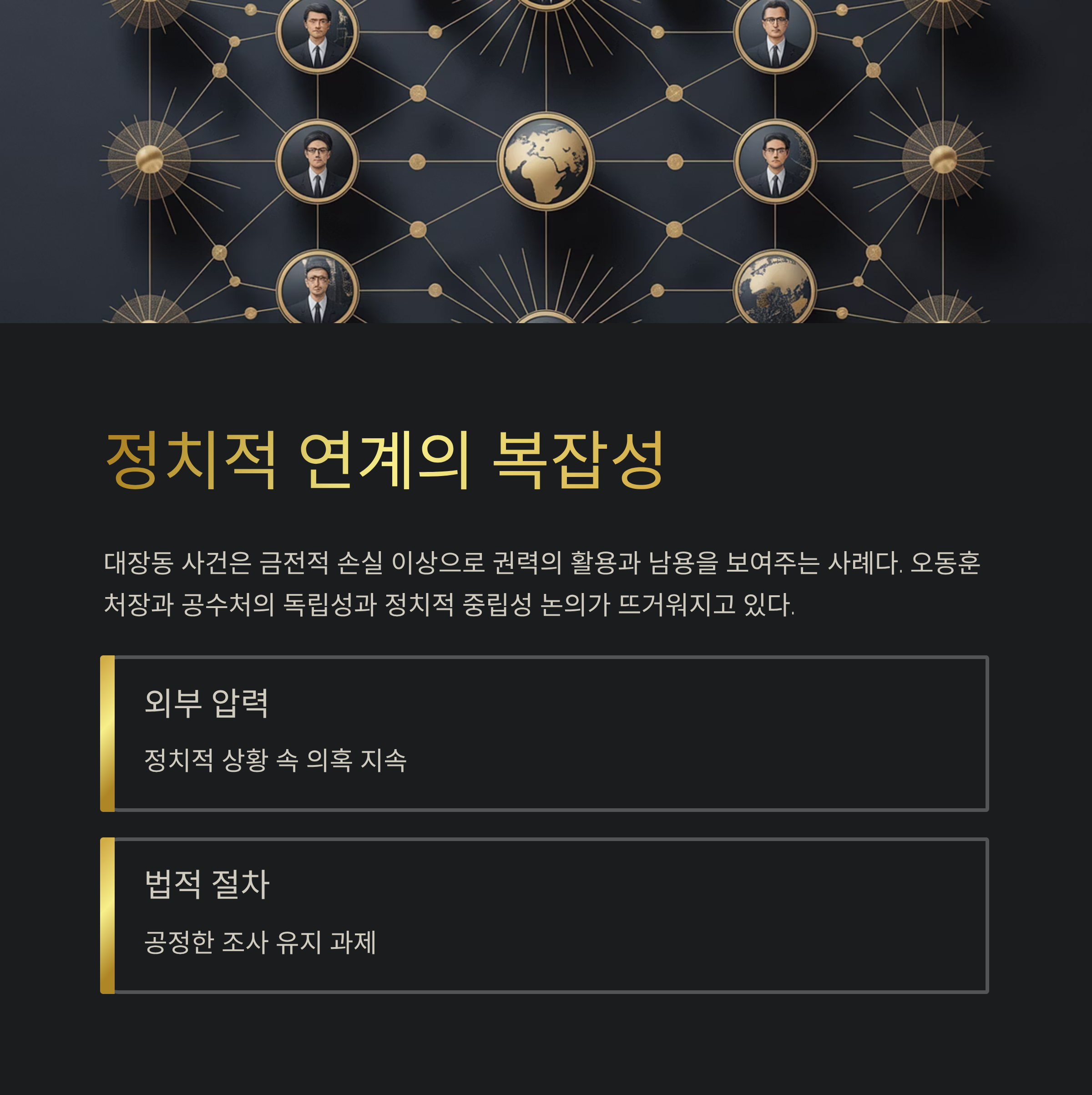 대장동 사건은 정치권력과 천문학적 금액의 손실이 복합적으로 얽힌 비리 스캔들이다. 이 사건은 단순한 부동산 비리 사건을 넘어 고위 공직자의 직권 남용과 그로 인한 검찰의 항소 포기 결정까지 포함되며, 이는 공수처 수사가 또다시 정치적인 갈등 안으로 들여다보일 기회로 작용하고 있다.