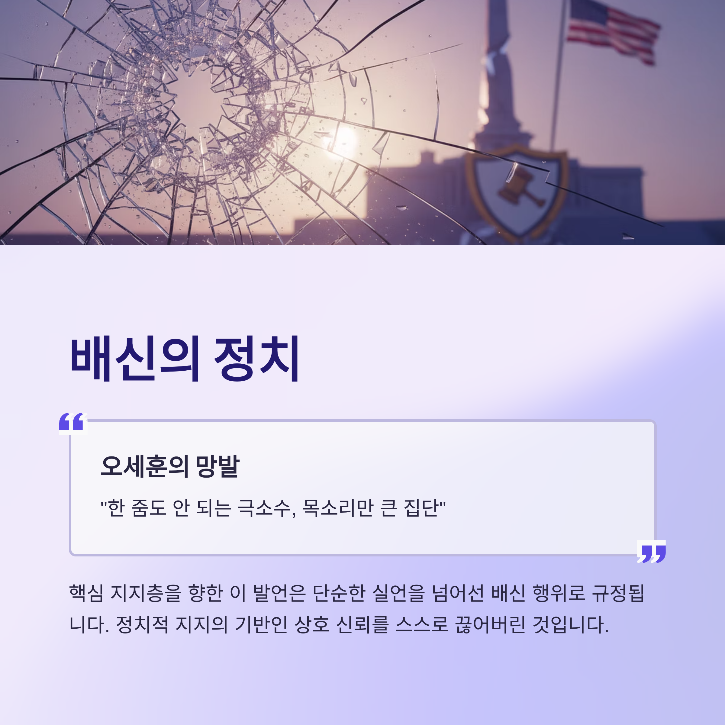 정치인에게 핵심 지지층은 가장 어려운 시기에 최후의 보루가 되어주는 존재입니다. 그러나 오세훈 시장은 자신의 정치적 위기를 타개하기 위해 바로 그 지지층의 가슴에 비수를 꽂는 선택을 했습니다. 국민의힘 당원과 자유우파 시민들을 향해 '한 줌도 안 되는 극소수', '목소리만 큰 집단'이라고 폄하한 것은 단순한 실언을 넘어선 배신 행위로 규정되고 있습니다. 이는 자신을 지지해 온 이들을 정치적 목적 달성을 위한 도구로만 여겼다는 인식을 심어주었으며, 스스로 정치적 고립을 자초하는 최악의 수였습니다. 지지자들 입장에서는 "너희들의 표는 필요 없다"는 모욕적인 언사를 들은 것과 마찬가지입니다.