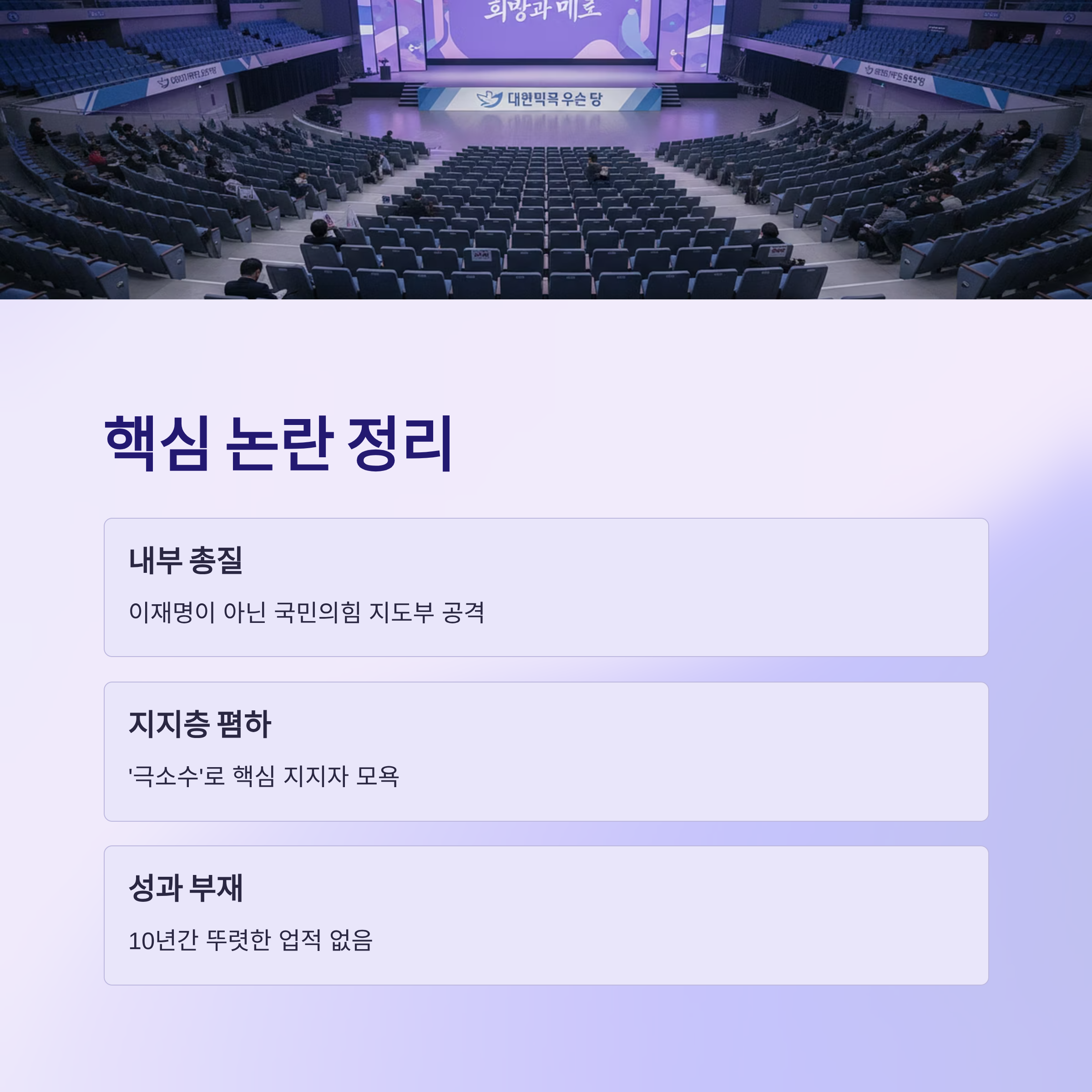 | A. 다가오는 지방선거를 앞두고 지지율이 정체되자, 그 원인을 외부가 아닌 국민의힘 내부와 핵심 지지층 탓으로 돌리며 공격했기 때문입니다. 이는 위기 상황에서 지지자를 배신한 행위로 여겨져 거센 비판을 받고 있습니다. |