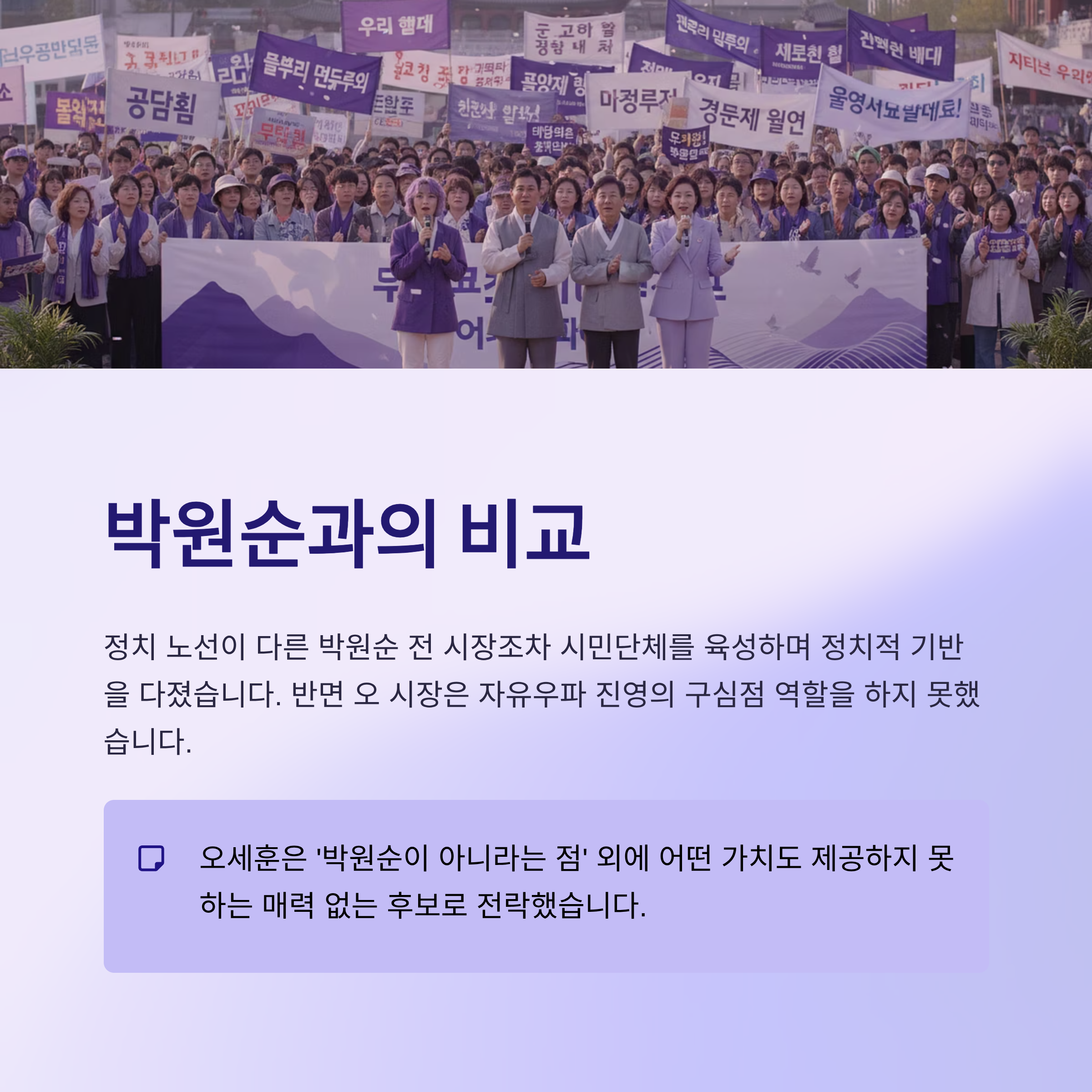 심지어 정치적 노선이 다른 박원순 전 시장과 비교해도 오 시장의 리더십은 초라하게 비칩니다. 박 전 시장은 시민단체를 육성하고 지원하며 자신의 정치적 기반을 공고히 다지는 데 주력했습니다. 비록 그 방식에 대한 비판은 존재하지만, 적어도 그는 자기편을 챙기고 세력을 조직하는 능력을 보여주었습니다. 반면 오 시장은 자유우파 진영의 구심점 역할을 하지 못했으며, 보수 진영의 가치를 시정에 반영하고 지지 기반을 튼튼하게 만드는 노력을 게을리했다는 비판을 받습니다. 결국 자유우파 지지자들에게 오 시장은 '박원순이 아니라는 점' 외에는 어떤 가치도 제공하지 못하는, 매력 없는 후보로 전락했다는 것이 냉정한 평가입니다.
