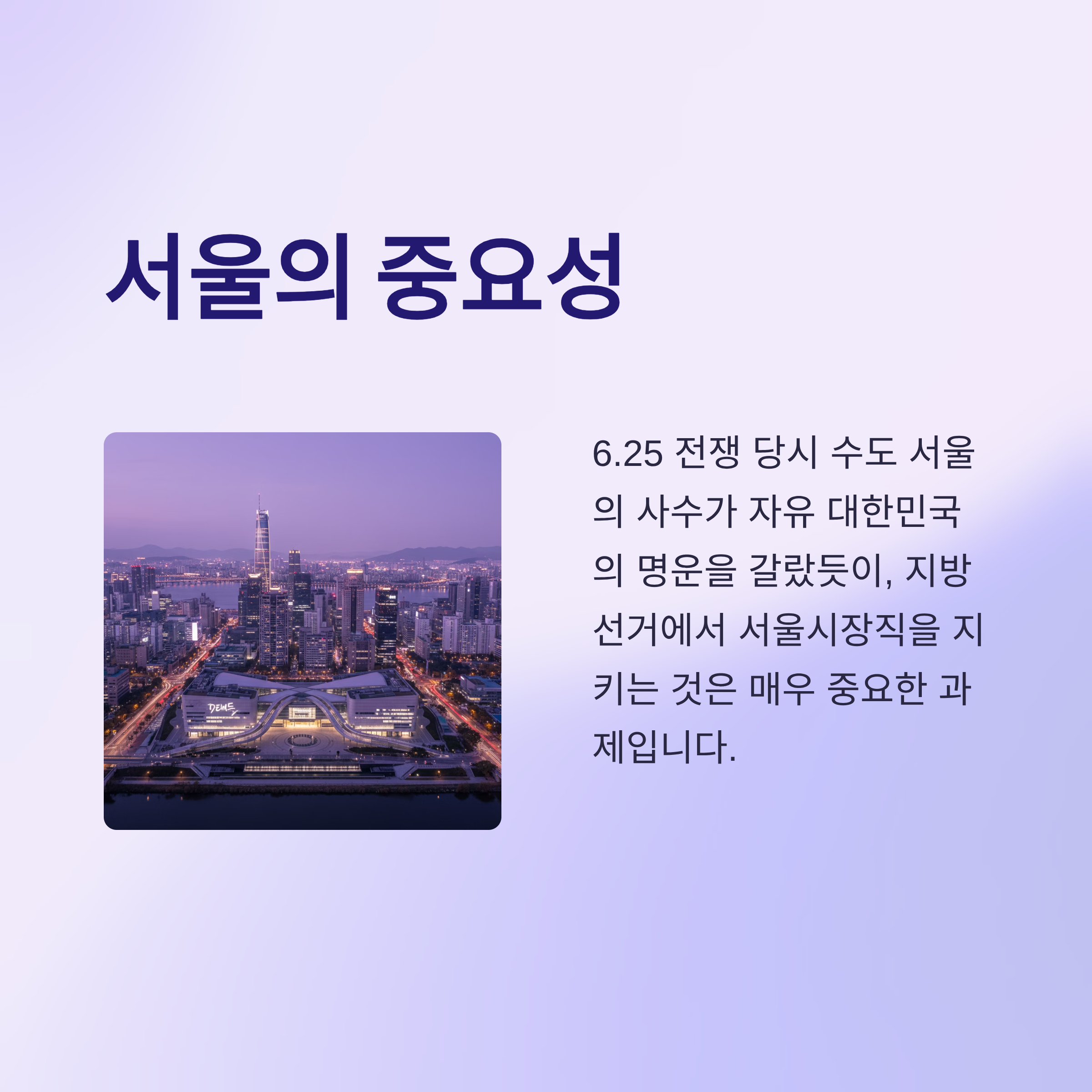 이제 국민의힘과 자유우파 진영은 심각한 고민에 직면했다. 6.25 전쟁 당시 수도 서울의 사수 여부가 자유 대한민국의 명운을 갈랐듯이, 다가오는 지방선거에서 서울시장직을 지키는 것은 매우 중요한 과제이다. 그러나 지지층의 신뢰를 잃고 내부 총질로 리더십에 치명상을 입은 후보를 다시 내세울 수는 없다. 오세훈 시장의 대안을 찾는 것은 더 이상 선택이 아닌 필수가 되었다. 현직 프리미엄과 인지도라는 낡은 공식에서 벗어나, 자유 대한민국의 가치를 수호하고 서울을 세계적인 도시로 이끌 비전과 실행력을 갖춘 새로운 인물을 찾아야 한다.