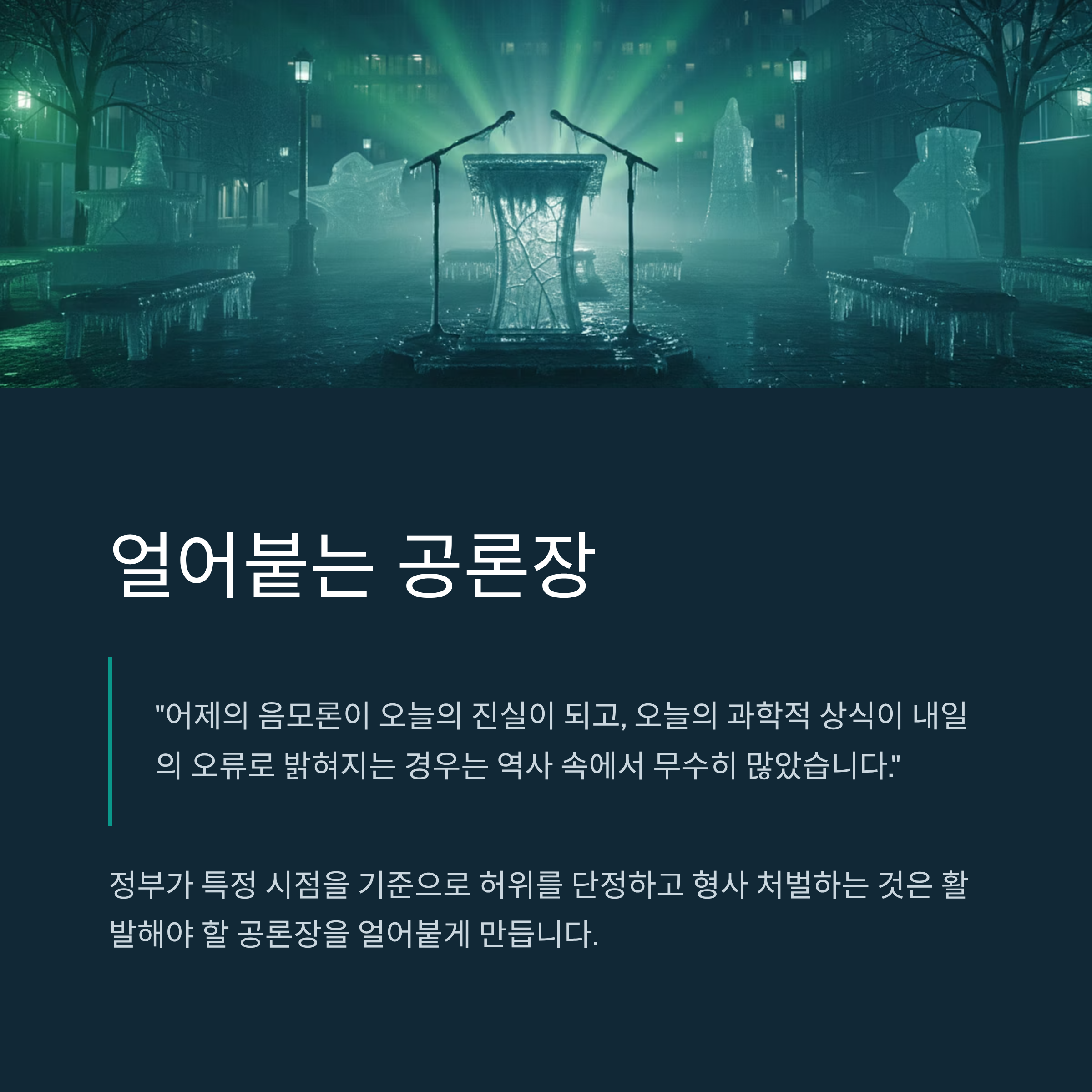 더욱 심각한 문제는 진실이 가진 '가변성'입니다. 어제의 음모론이 오늘의 진실이 되고, 오늘의 과학적 상식이 내일의 오류로 밝혀지는 경우는 역사 속에서 무수히 많았습니다. 그럼에도 불구하고 정부가 특정 시점을 기준으로 "이것은 허위다"라고 단정하고 형사 처벌의 잣대를 들이대는 것은, 활발해야 할 공론장을 얼어붙게 만듭니다. 이는 시민들의 자유로운 상상력과 비판 의식을 위축시키고, 결국 권력의 눈치를 보며 표현의 수위를 조절하는 '자기 검열'을 일상화시키는 결과를 초래할 것입니다.