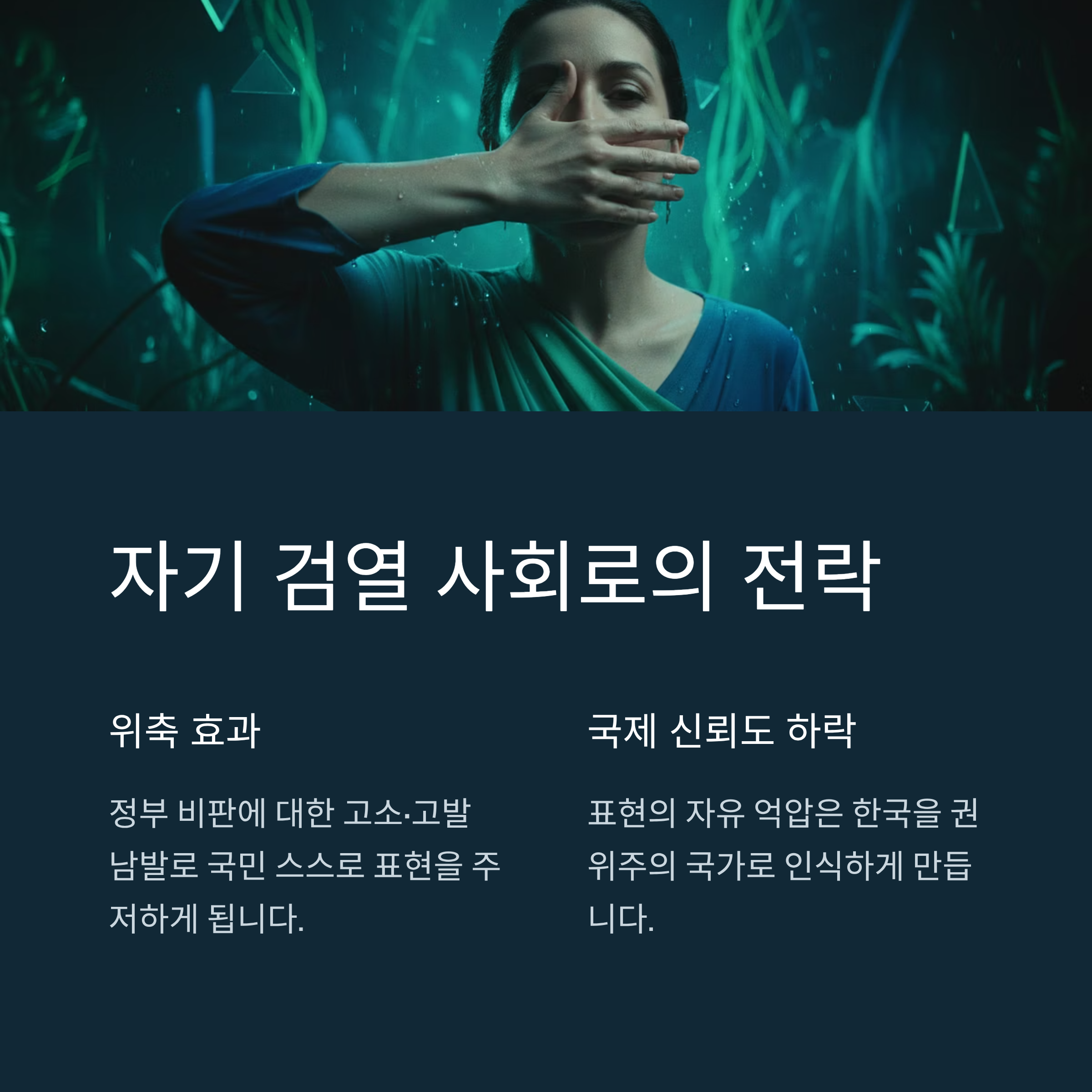 자기 검열의 확산: 정부 비판 목소리에 대한 고소 및 고발이 남발되면서, 국민 스스로가 표현을 주저하게 되는 '위축 효과(Chilling Effect)'가 사회 전반으로 확산될 수 있습니다.