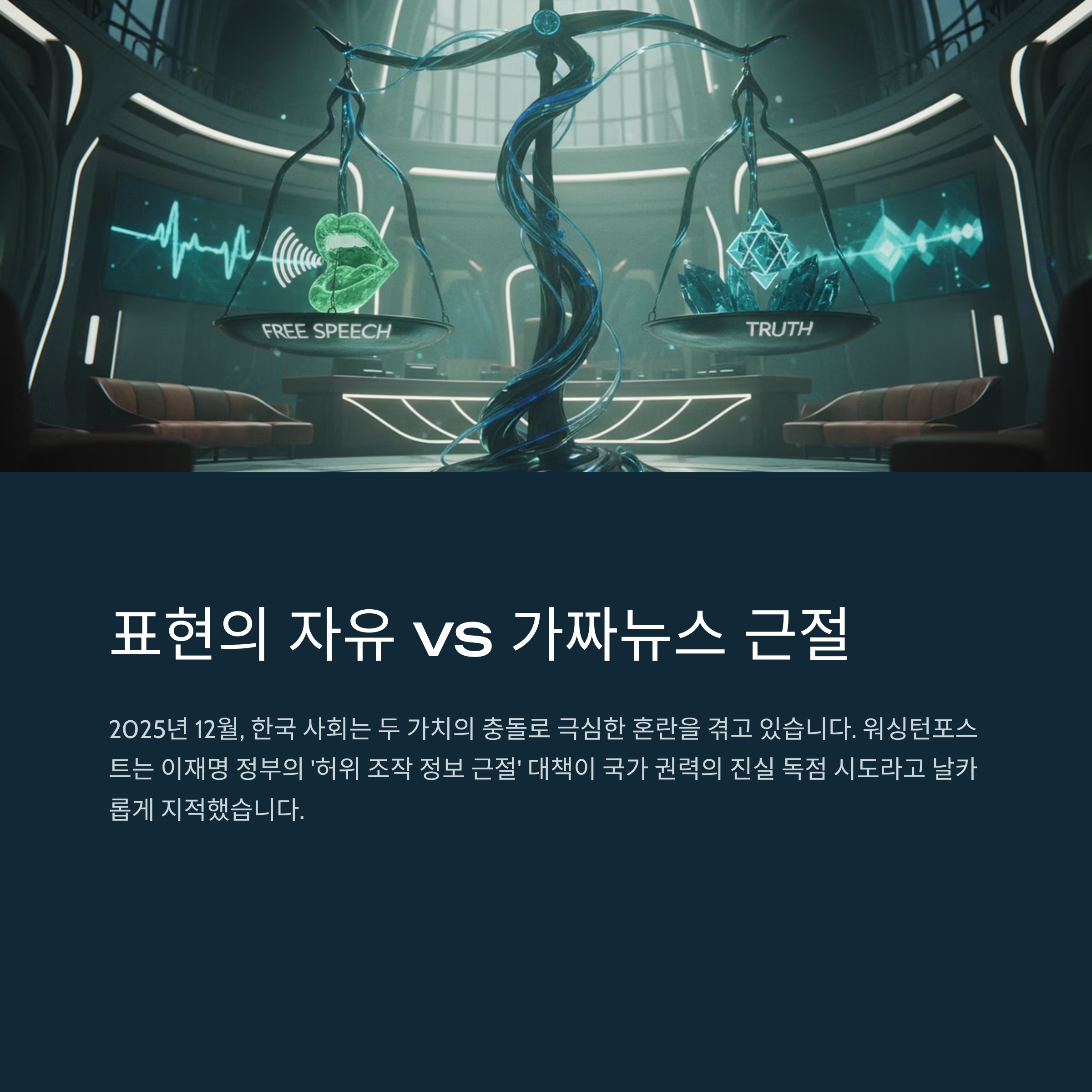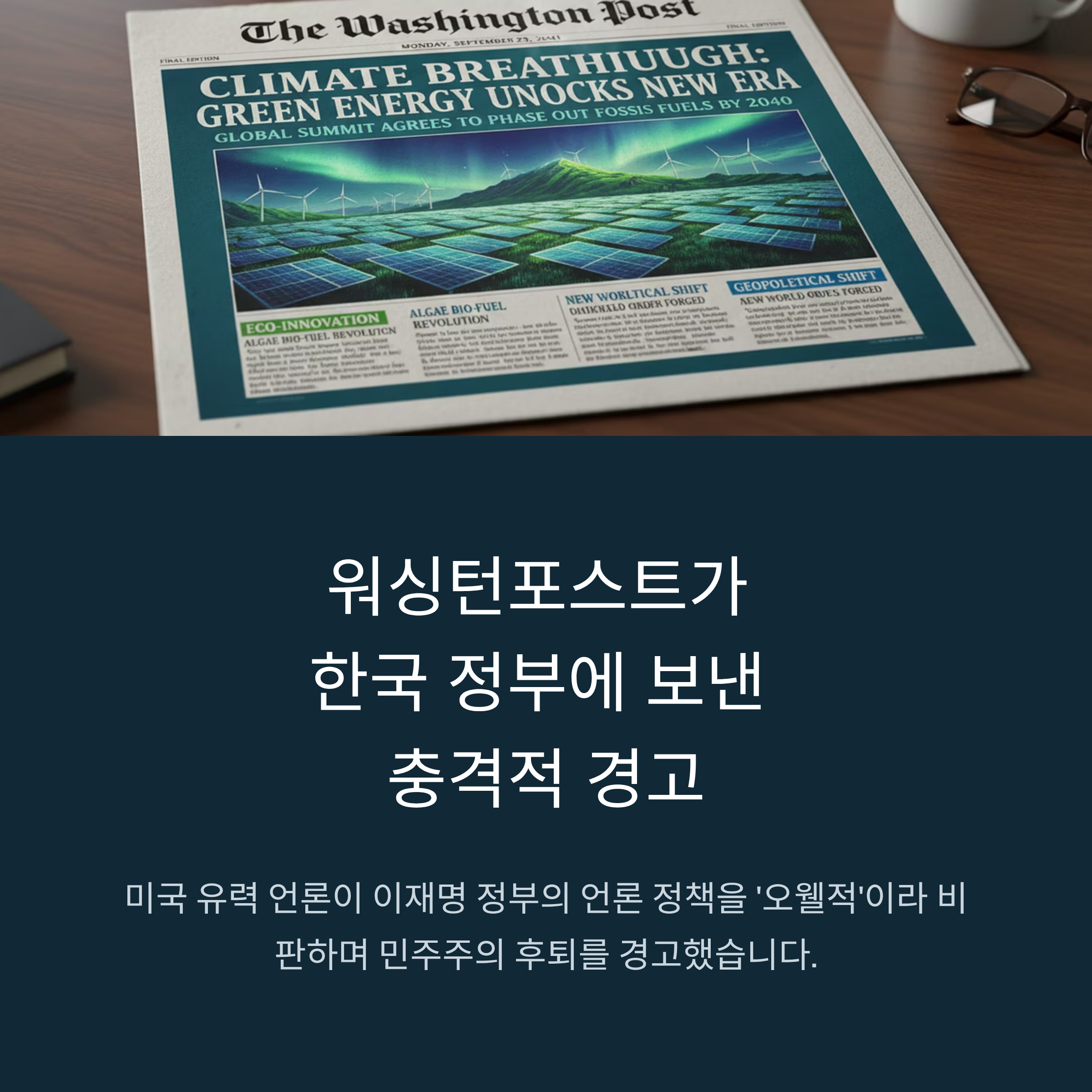 2025년 12월, 대한민국 사회는 '표현의 자유'와 '가짜 뉴스 근절'이라는 두 가치가 충돌하며 극심한 혼란을 겪고 있습니다. 이러한 상황 속에서 미국의 저명한 일간지 워싱턴포스트(WP)가 이재명 정부의 언론 정책에 대해 매우 이례적이고 직설적인 경고 메시지를 담은 칼럼을 게재하며 국내외에 큰 파문을 일으켰습니다. 이는 단순한 해외 언론의 비판을 넘어, 자유 민주주의의 근본 가치가 위협받고 있다는 국제 사회의 깊은 우려를 명확히 보여주는 신호입니다.