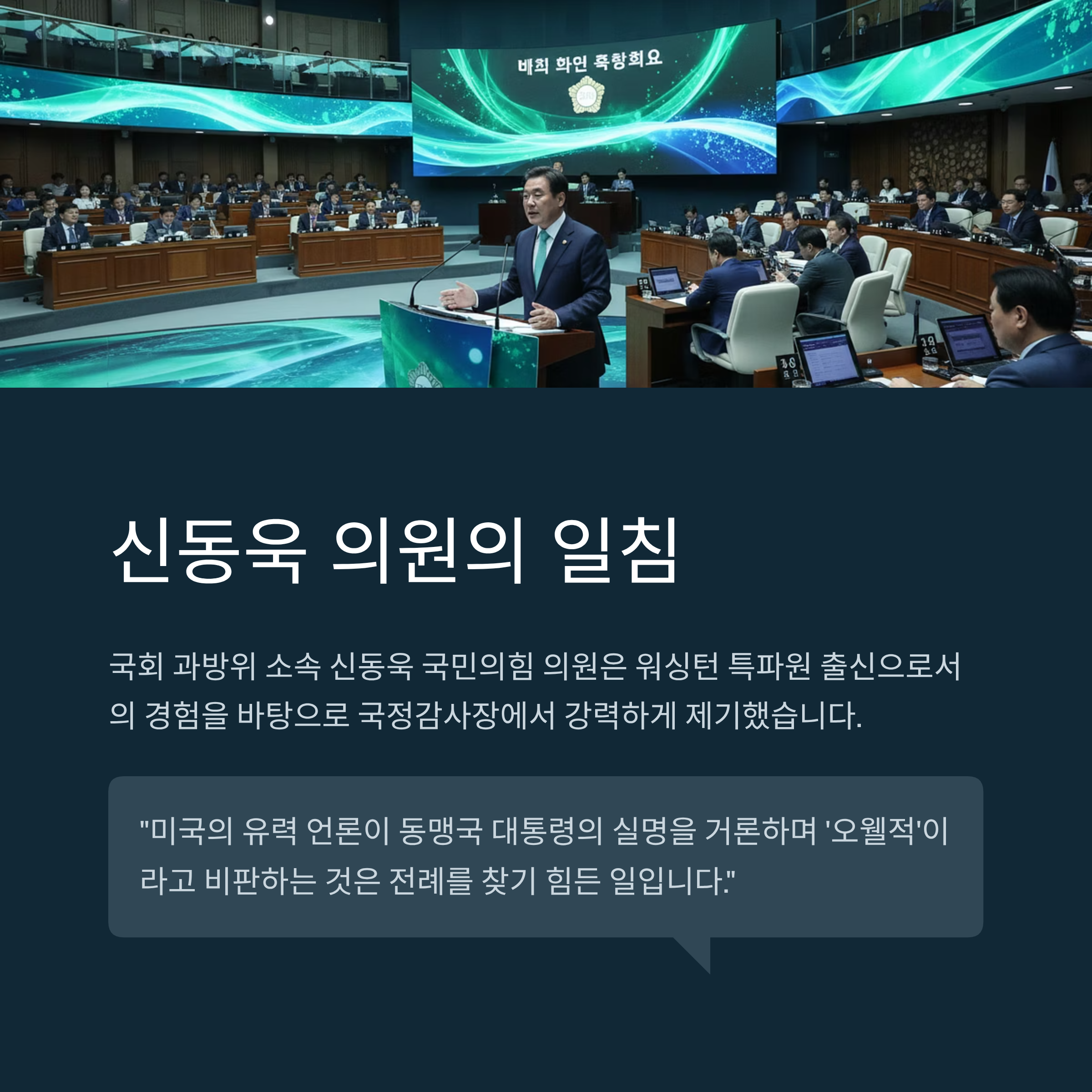 국회 과방위 소속 신동욱 국민의힘 의원은 워싱턴 특파원 출신으로서의 경험을 바탕으로 이러한 국제적 우려를 국정감사장에서 강력하게 제기했습니다. 신 의원은 "미국의 유력 언론이 동맹국 대통령의 실명을 거론하며 '오웰적'이라고 비판하는 것은 전례를 찾기 힘든 일"이라며 사태의 심각성을 지적했습니다. 그는 표현의 자유를 수호해야 할 방송통신위원회가 오히려 정권의 돌격대가 되어 비판의 목소리를 억누르는 데 앞장서고 있다고 질타하며, 규제 기관의 존재 이유를 되물었습니다.