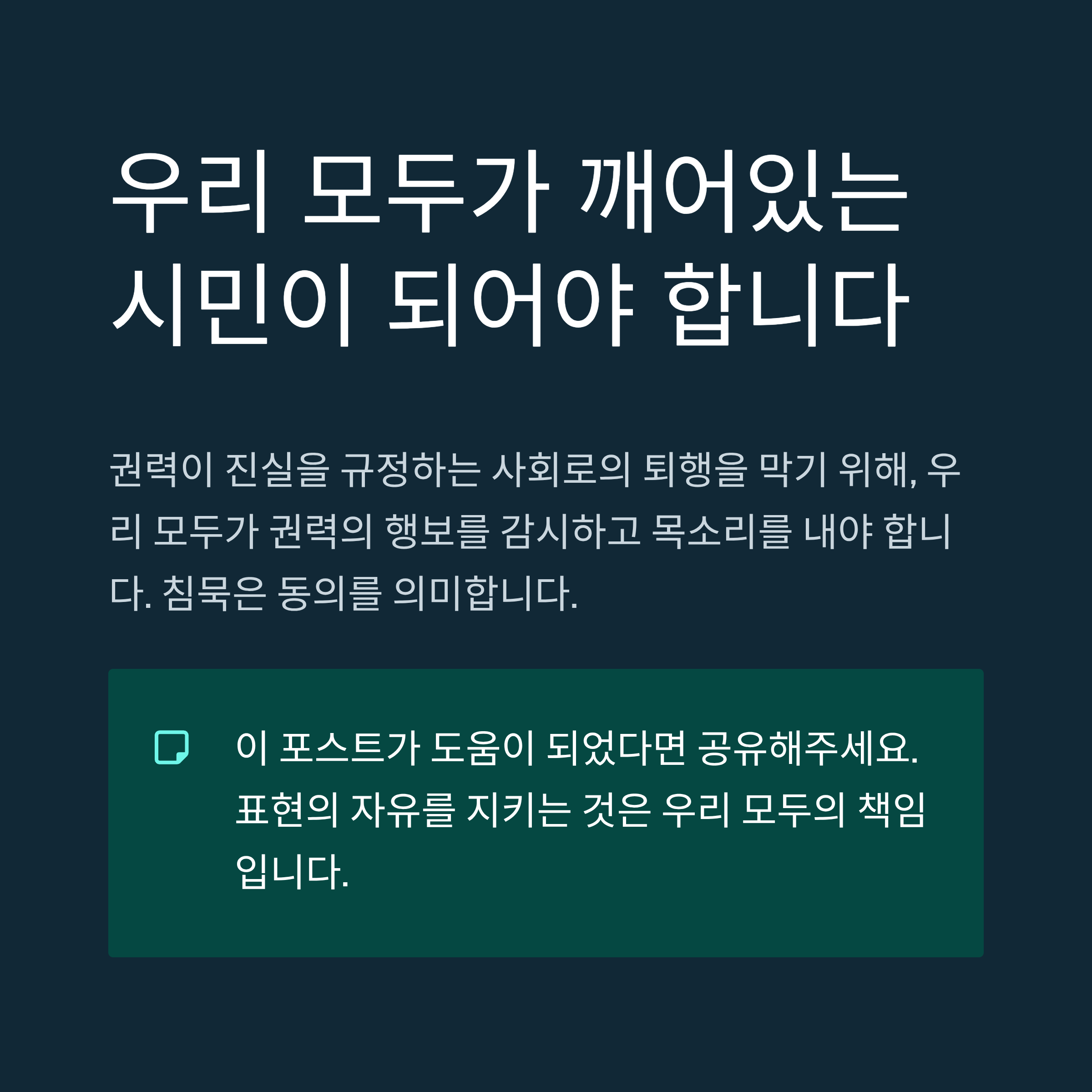 표현의 자유는 공기와 같아서, 존재할 때는 그 소중함을 느끼지 못하지만 사라지는 순간 사회 전체가 질식하게 됩니다. 한번 축소된 자유의 영역을 다시 확장하는 것은 거의 불가능에 가깝습니다. 그 대가는 정치인이나 권력자가 아닌, 우리 평범한 시민들이 감시와 통제를 일상으로 받아들여야 하는 암울한 미래로 돌아올 것입니다. 권력이 진실을 규정하는 사회로의 퇴행을 막기 위해, 우리 모두가 깨어있는 시민으로서 권력의 행보를 감시하고 목소리를 내야 합니다. 침묵은 동의를 의미하며, 그 끝은 돌이킬 수 없는 자유의 상실임을 반드시 기억해야 합니다.