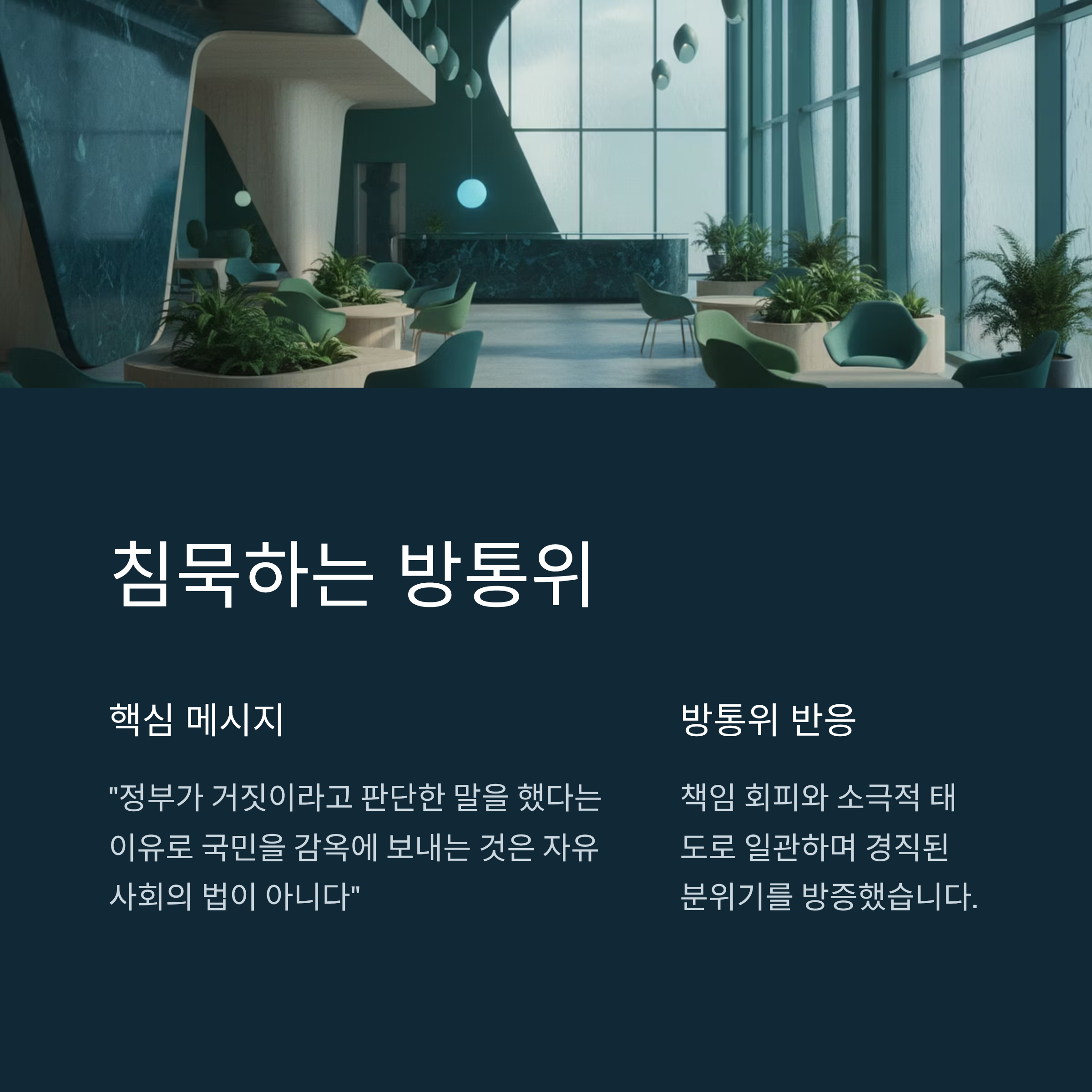 신 의원이 인용한 WP 칼럼의 핵심 메시지는 "정부가 거짓이라고 판단한 말을 했다는 이유로 국민을 감옥에 보내는 것은 자유 사회의 법이 아니다"라는 것입니다. 하지만 이러한 지적에 대한 방송통신위원회 관계자들의 반응은 책임을 회피하거나 소극적인 태도로 일관했습니다. 이는 정부의 언론 통제 기조에 대해 공직 사회 내부에서조차 합리적인 반론을 제기하기 어려운 경직된 분위기가 형성되었음을 방증합니다. 비판 세력을 향한 무차별적인 고소·고발은 정치인은 물론 일반 국민의 입까지 막는 '위축 효과'를 극대화하며, 민주주의 시스템의 정상적인 작동을 마비시키고 있습니다.