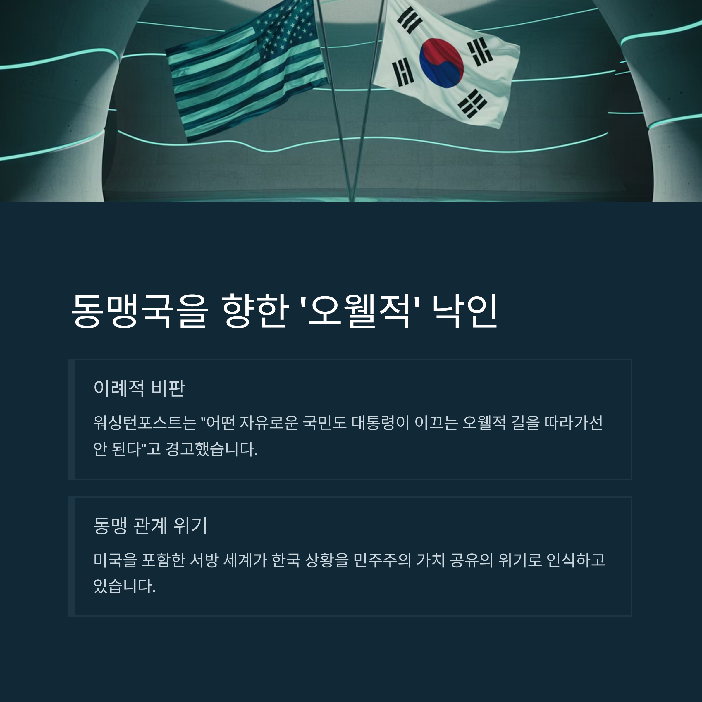 워싱턴포스트의 칼럼은 단순한 논평을 넘어 한국의 국제적 위상에 직접적인 영향을 미치는 중대한 경고 신호입니다. WP는 한국의 유력 지도자가 추진하는 정책이 자유 사회의 보편적 원칙과 정면으로 배치된다고 판단했습니다. 특히 "어떤 자유로운 국민도 대통령이 이끄는 오웰적 길을 따라가선 안 된다"는 문장은 외교적 수사를 넘어선, 이례적으로 강력한 비판입니다. 이는 미국을 포함한 서방 세계가 현재 한국의 상황을 단순한 정책적 이견이 아닌, 민주주의라는 핵심 가치를 공유하는 동맹 관계의 근간이 흔들리는 위기로 인식하고 있음을 보여줍니다.