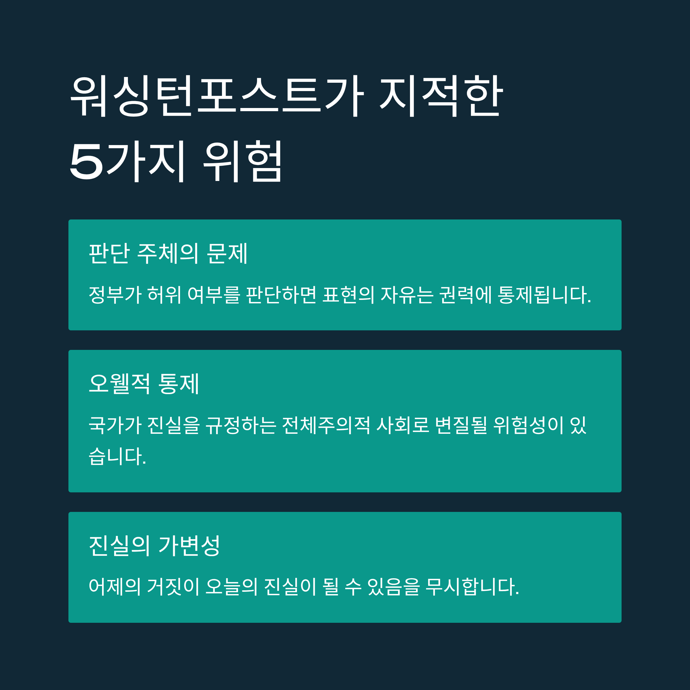 | A1. WP는 이재명 정부가 '가짜 뉴스 처벌'이라는 명분을 내세워 국가 권력이 진실과 거짓을 판단하는 심판자 역할을 하려 한다고 비판했습니다. 이는 정부에 비판적인 목소리를 억압하고 표현의 자유를 근본적으로 위축시키는 '오웰적(Orwellian)' 통제가 될 수 있다고 강력히 경고했습니다. |