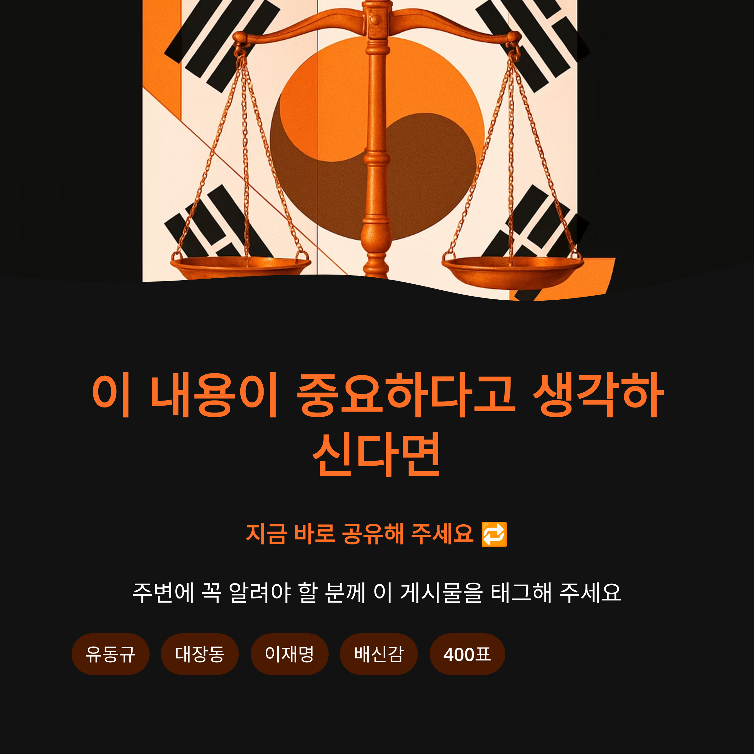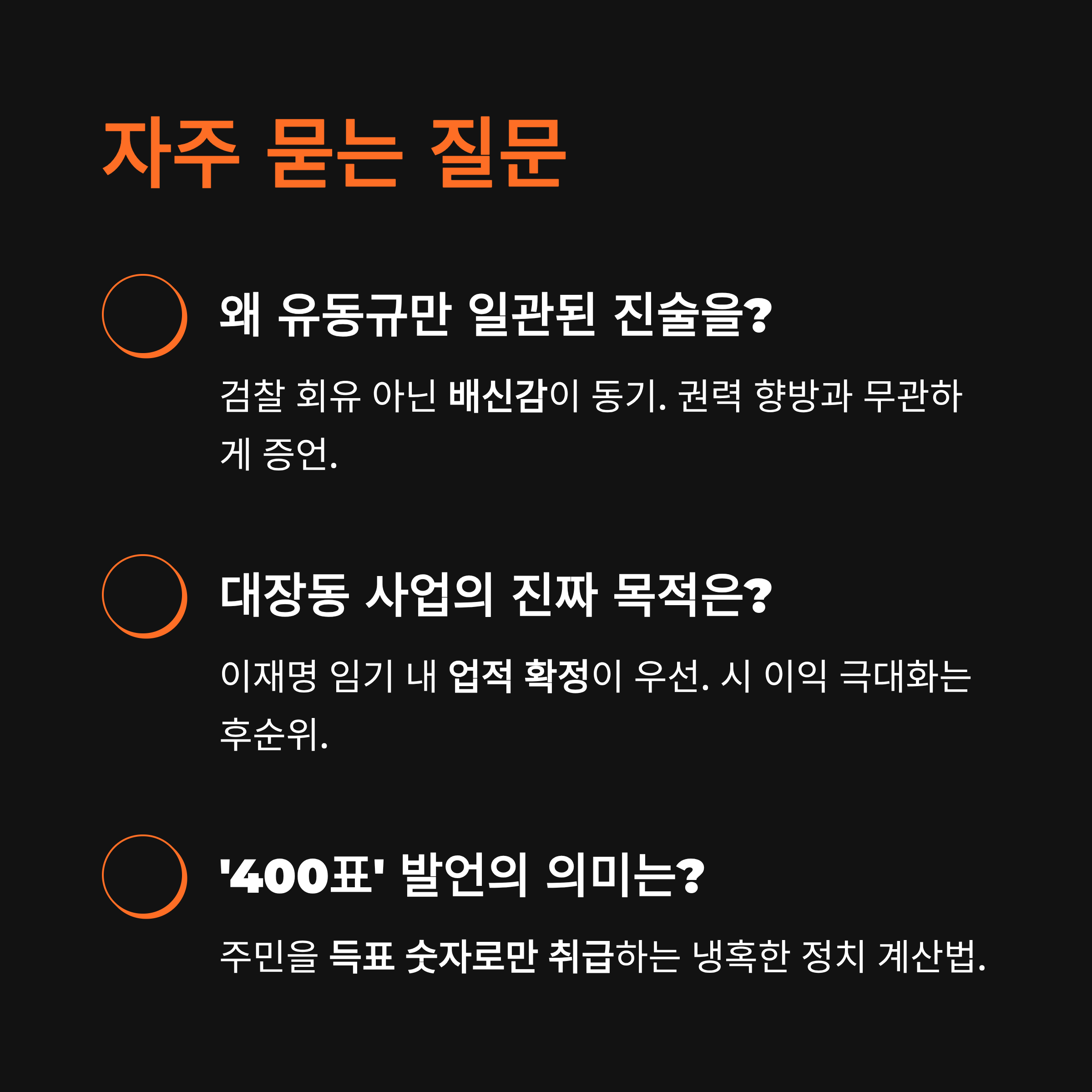 유동규 전 본부장의 법정 증언은 대장동 사건의 실체적 진실에 다가가는 중요한 단서를 제공함과 동시에, 이재명 대통령의 리더십과 정치 철학의 민낯을 드러내고 있습니다. 남욱, 이화영 등 다른 관련자들이 권력의 변화에 따라 진술을 바꾸며 '사법 리스크'를 회피하려는 모습을 보이는 것과 달리, 유동규는 '배신감'이라는 인간적인 감정을 동기로 일관된 주장을 펼치고 있습니다. 그의 증언이 100% 진실이라고 단정할 수는 없지만, 그가 폭로한 '업적 쌓기용 사업 구조'와 '400표' 발언은 구체적이고 설득력이 있습니다.