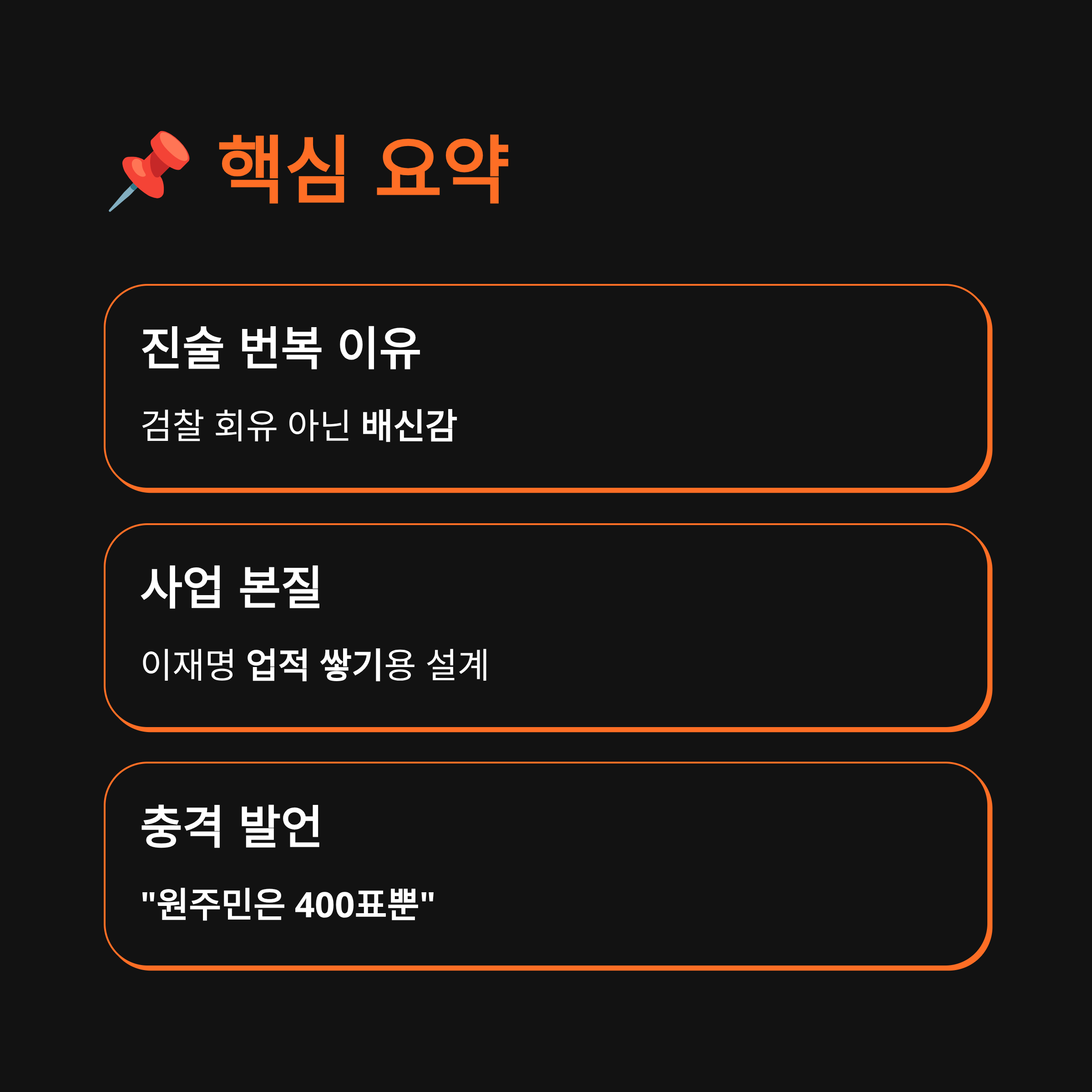 대장동 및 쌍방울 사건의 다른 관련자들과 달리, 유동규 전 본부장은 자신의 진술 변경이 검찰의 회유나 압박이 아닌 이재명 대통령과 정진상 전 실장에 대한 '배신감' 때문이라고 법정에서 명확히 밝혔습니다. 그는 이재명 시장의 '업적 쌓기'를 위해 대장동 사업이 확정 이익 방식으로 설계되었으며, 이 과정에서 원주민들의 이익은 '400표밖에 안 된다'는 충격적인 이유로 묵살당했다고 폭로했습니다.