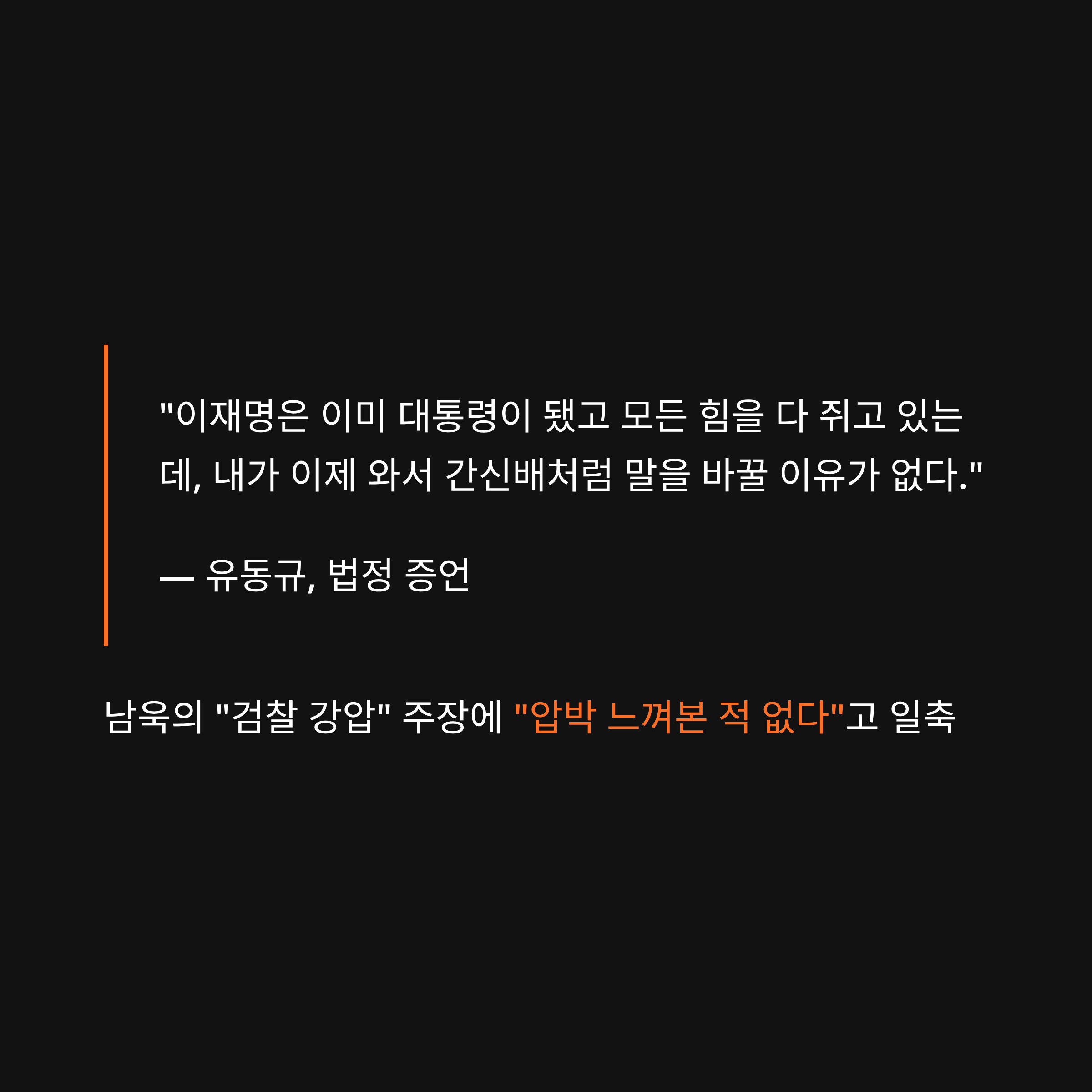 이는 최근 국회 청문회에서 "검찰의 목표는 이재명 하나였다"며 강압 수사를 주장한 남욱 변호사의 진술과 정면으로 배치됩니다. 유동규는 남욱의 주장에 대해 "나는 압박을 느껴본 적이 없다"고 일축하며, "이재명은 이미 대통령이 됐고 모든 힘을 다 쥐고 있는데 내가 이제 와서 간신배처럼 말을 바꿀 이유가 없다"고 강조했습니다. 그의 이러한 일관된 태도는 권력의 향방과 무관하게 자신의 경험과 감정에 근거해 진술하고 있다는 점을 부각하며, 다른 관련자들의 진술 번복 배경에 의문을 제기하게 만듭니다.
