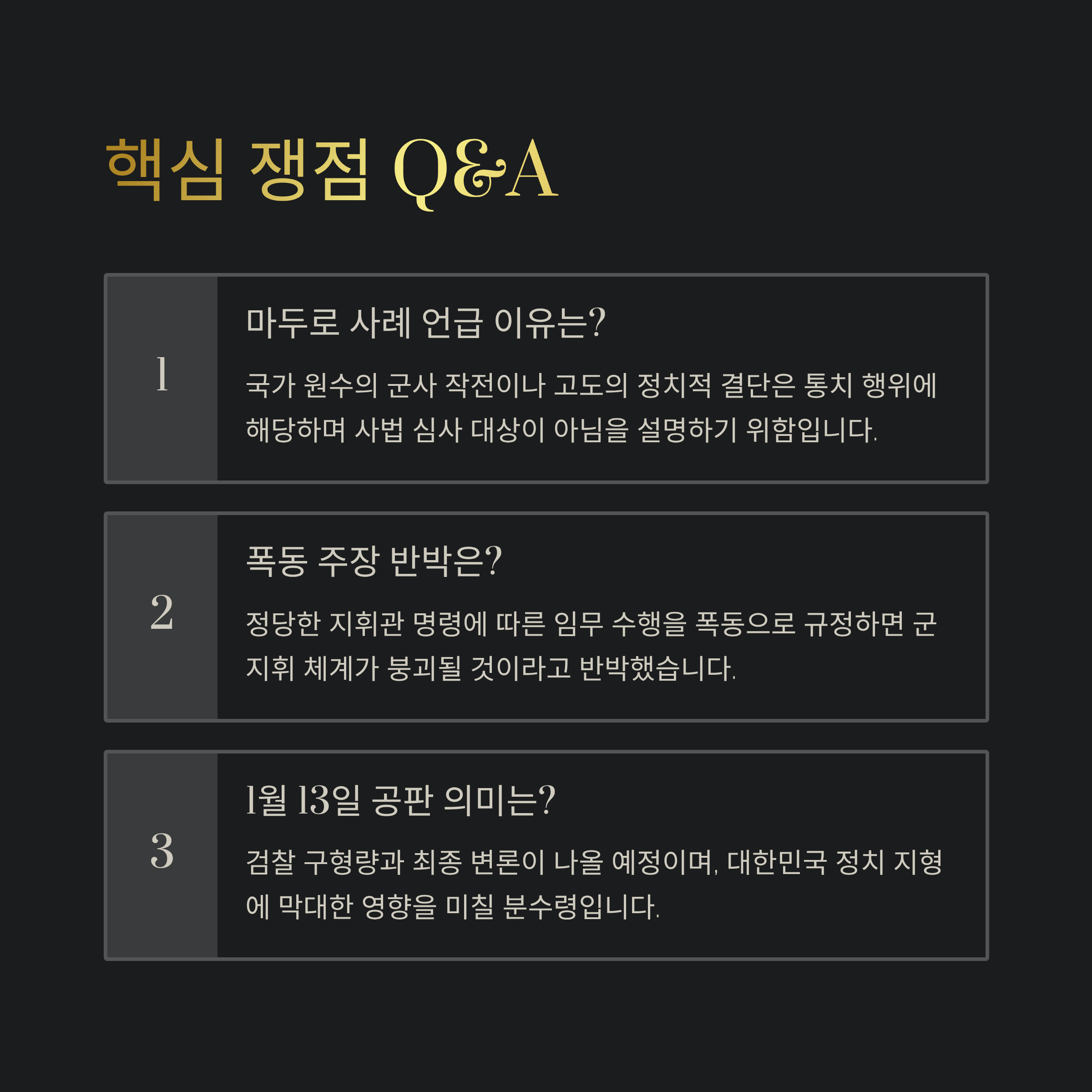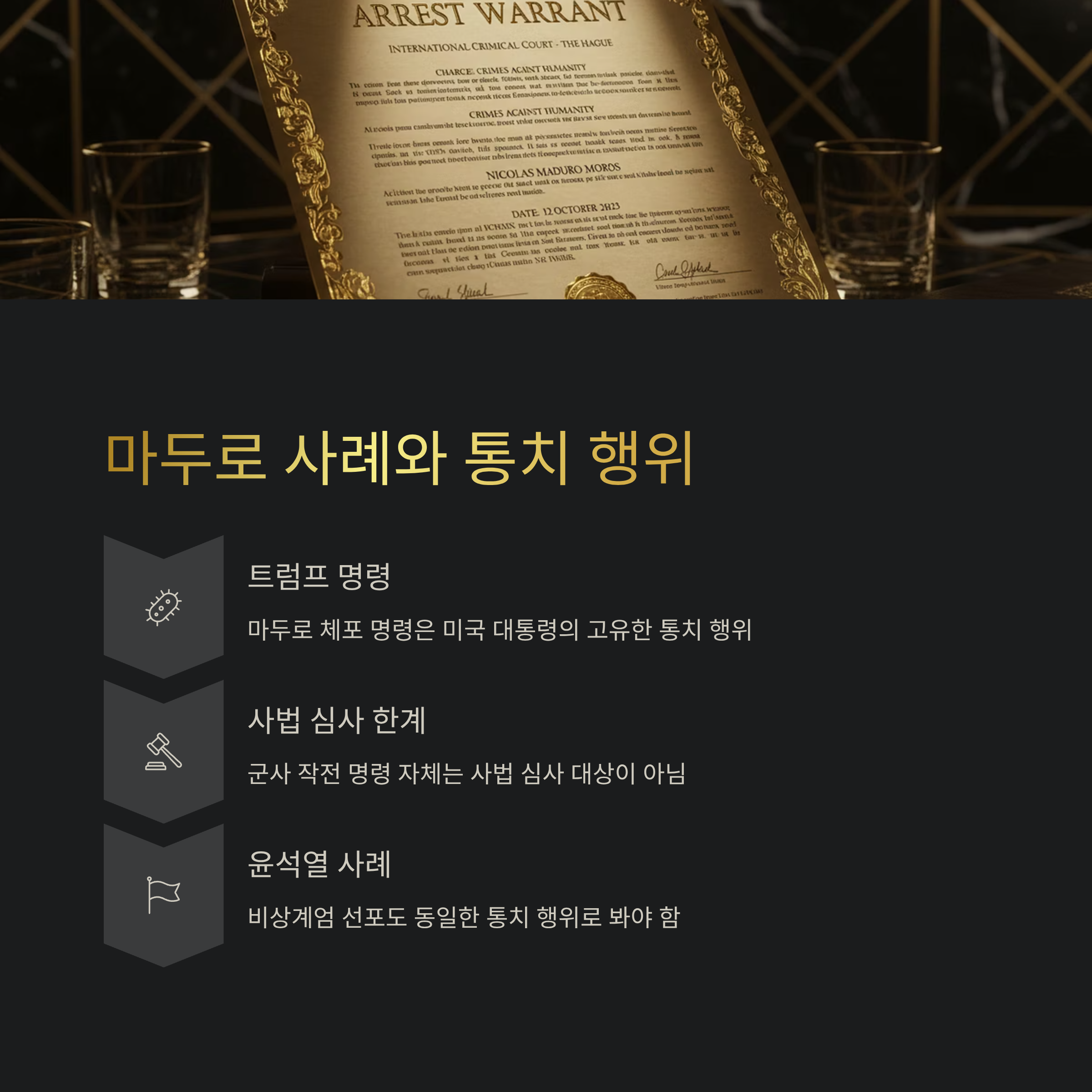 | A1. 트럼프 전 대통령이 마두로 체포를 명령한 것을 예로 들어, 국가 원수의 군사 작전이나 고도의 정치적 결단은 '통치 행위'에 해당함을 설명하기 위함입니다. 이러한 행위는 사법 심사의 대상이 아니며, 따라서 윤 전 대통령의 계엄 선포 역시 내란죄로 처벌할 수 없다는 논리를 뒷받침하는 근거로 사용되었습니다. |
