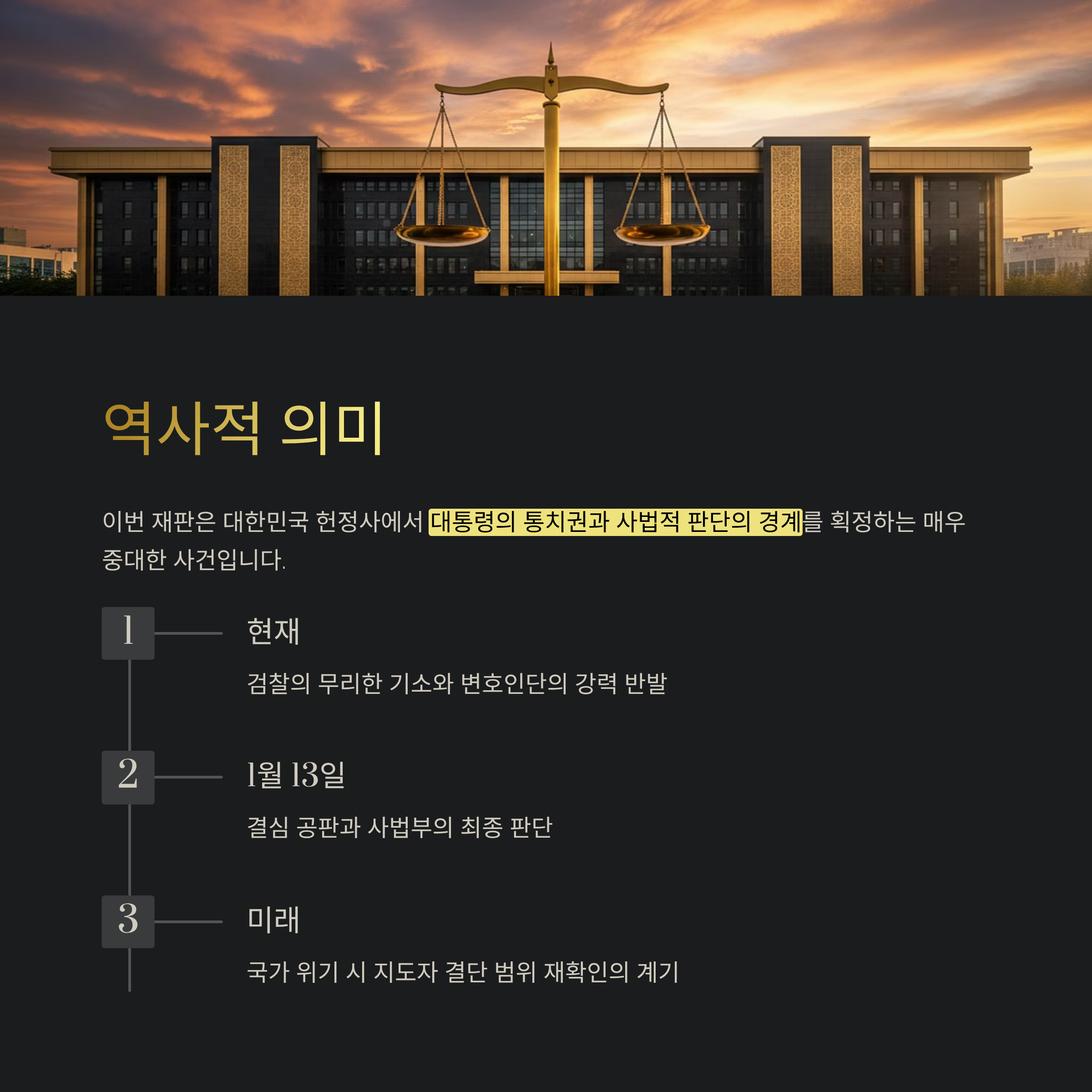 오는 1월 13일 내려질 사법부의 판단은 단순히 전직 대통령에 대한 처벌 유무를 떠나, 국가 위기 시 지도자의 결단 범위와 국가 안보 시스템의 작동 원리를 재확인하는 계기가 될 것입니다. 독자 여러분은 이번 재판이 정치적 보복의 장이 되는지, 아니면 헌법 가치를 바로 세우는 정의의 장이 되는지 냉철한 시각으로 지켜봐야 할 것입니다. 검찰권의 남용을 막고 올바른 헌정 질서를 확립하기 위해 재판부의 현명한 판단이 그 어느 때보다 필요한 시점입니다.