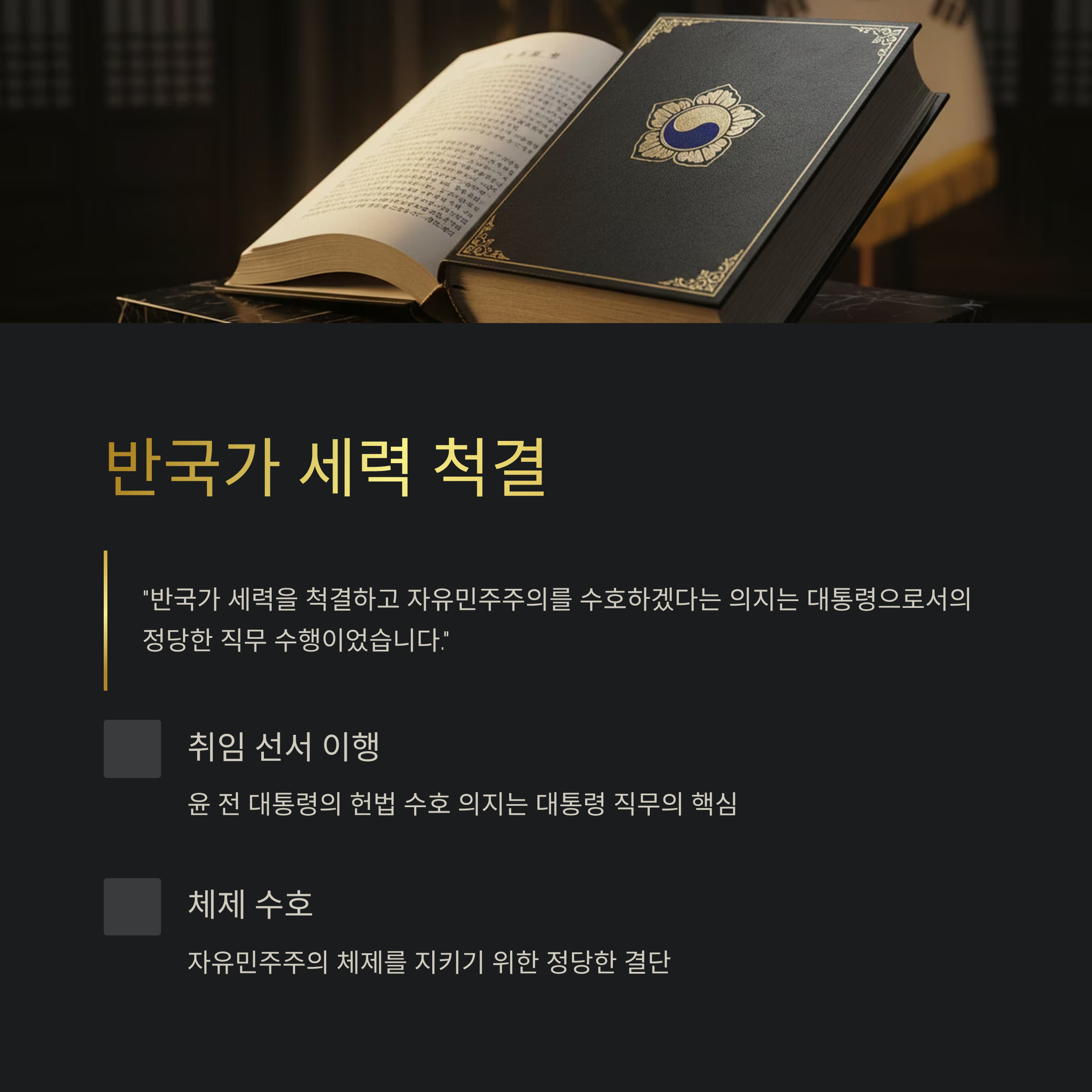 윤 전 대통령이 취임 선서에서 밝힌 대로 반국가 세력을 척결하고 자유민주주의를 수호하겠다는 의지는 대통령으로서의 정당한 직무 수행이었습니다. 변호인단은 이 재판이 단순한 법리 다툼이 아니라, 체제 수호 세력과 반국가 세력 간의 대결이라고 규정했습니다. 따라서 검찰이 대통령의 헌법 수호 의지를 내란으로 둔갑시킨 것은, 검찰 스스로가 반국가 세력의 논리에 동조하고 있음을 보여주는 것이라며 공소 기각의 당위성을 역설했습니다.
