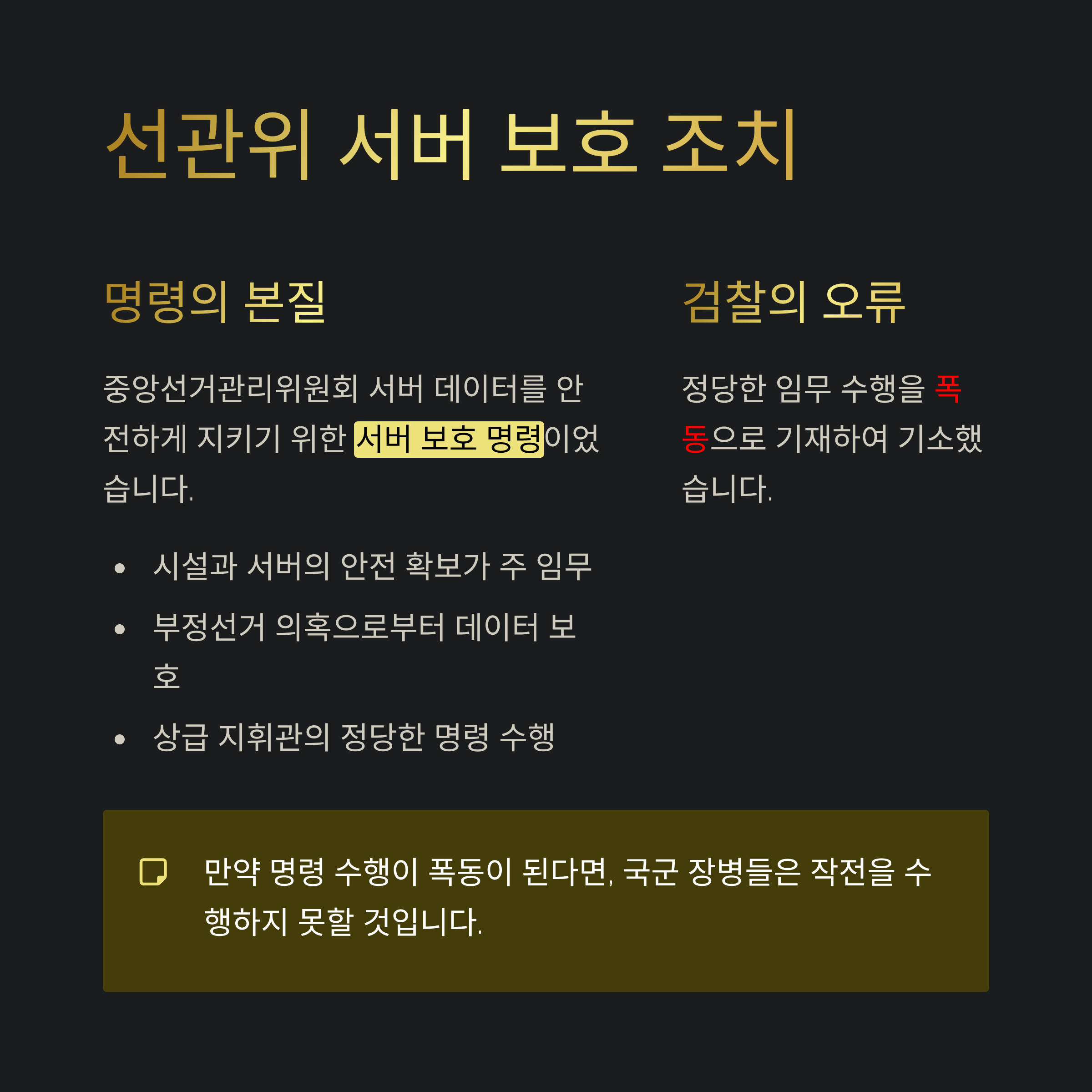 변호인단은 중앙선거관리위원회(선관위)에 군 병력이 진입한 것은 부정선거 의혹 등으로부터 서버 데이터를 안전하게 지키기 위한 '서버 보호 명령'이었다고 주장합니다. 당시 내려진 명령지를 보면 시설과 서버의 안전 확보가 주 임무였음이 명백하다는 것입니다. 그러나 검찰은 이를 '폭동'으로 기재하여 기소했습니다. 변호인은 이러한 검찰의 시각이 군의 명령 체계를 심각하게 훼손할 수 있다고 경고합니다.