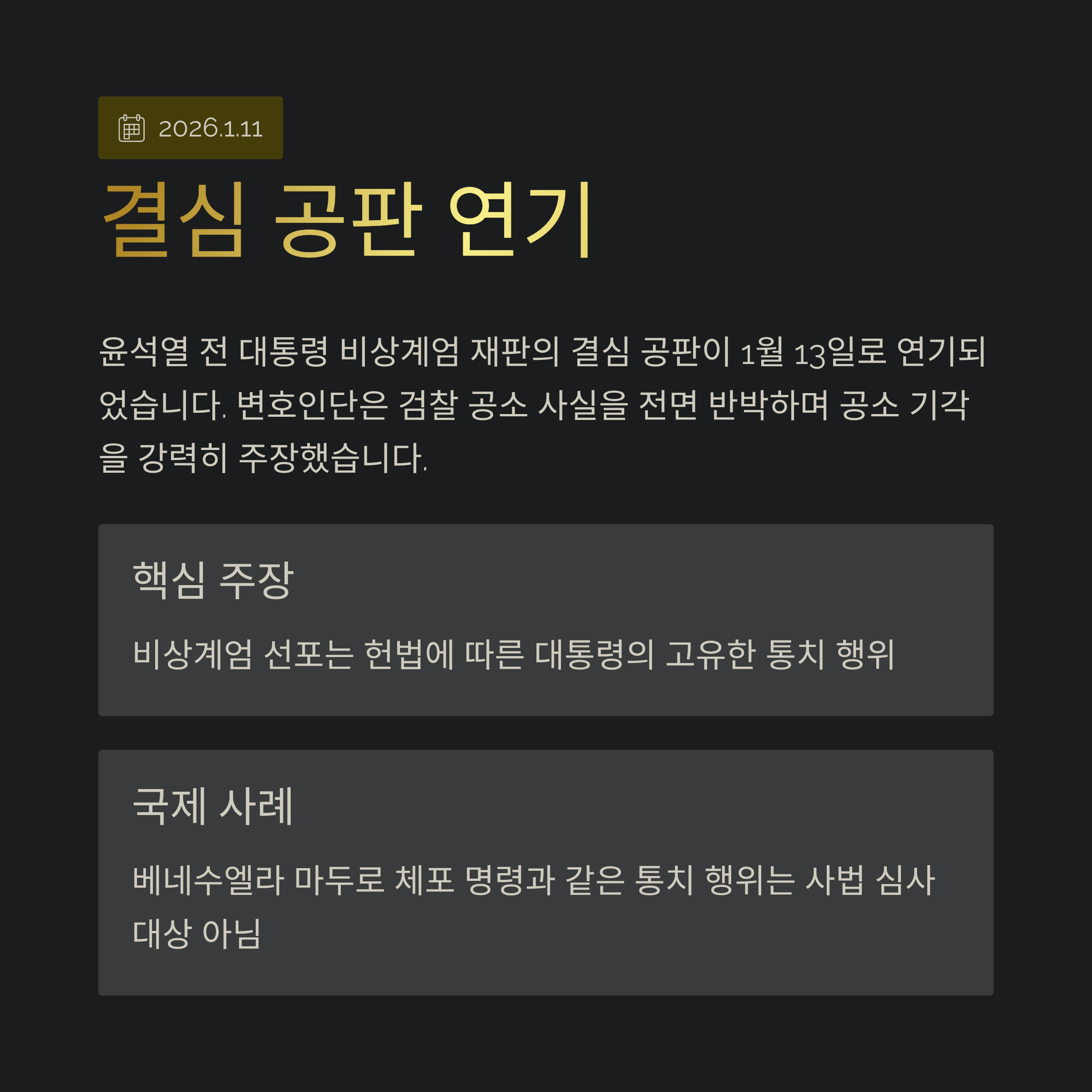 2026년 1월, 전직 대통령의 사법 리스크로 대한민국 정국이 뜨겁게 달아오르고 있습니다. 윤석열 전 대통령에 대한 비상계엄 관련 재판의 결심 공판이 당초 예정보다 늦어진 1월 13일로 연기되었습니다. 지난 1월 9일 진행된 공판에서 윤 전 대통령 측 변호인인 이하상 변호사는 검찰의 공소 사실을 전면 반박하며 '공소 기각'을 강력히 주장했습니다.