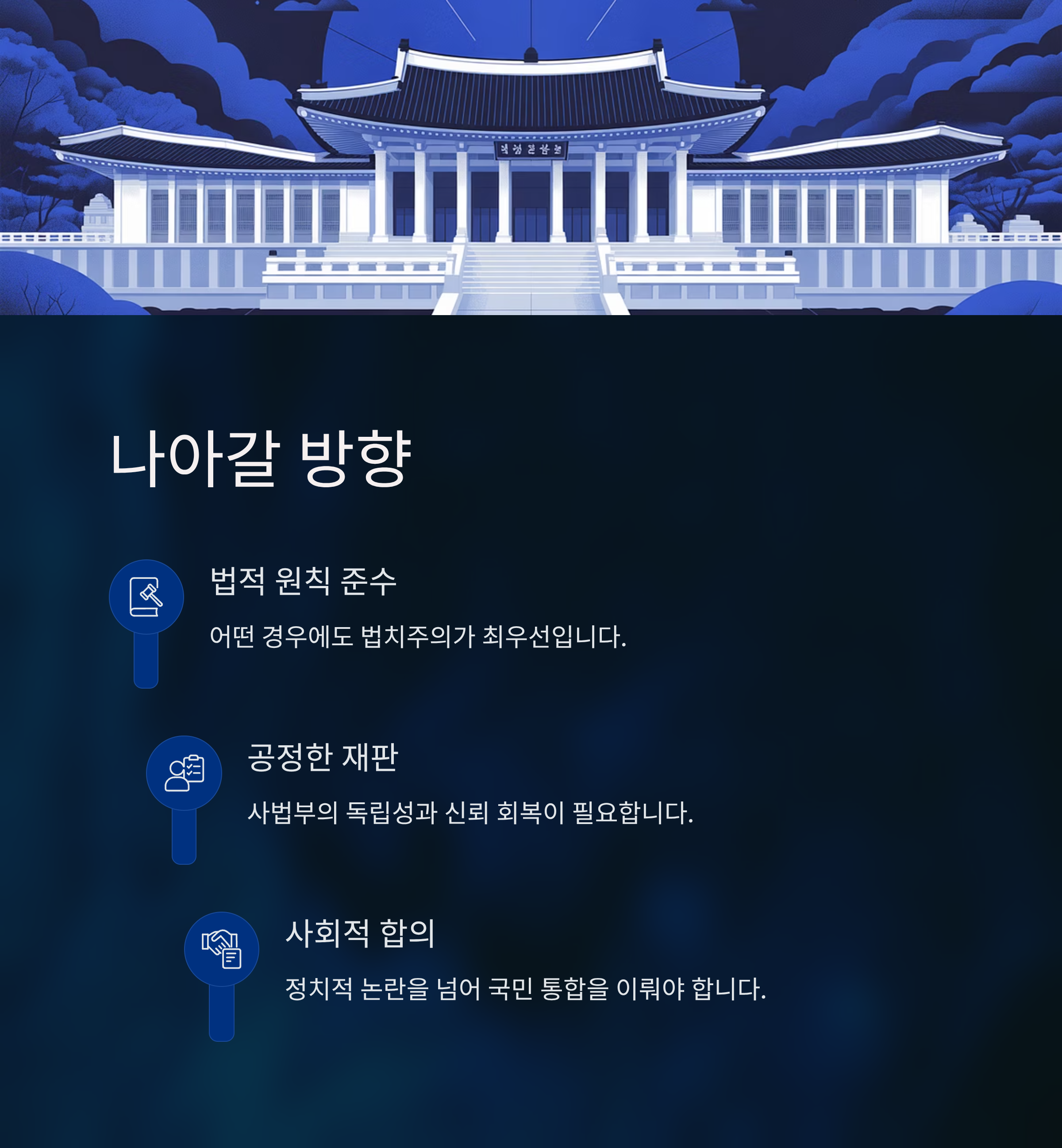 박지원 전 의원의 발언은 법적 측면에서 정당한 문제 제기라기보다는 정치적 의도가 담긴 메시지로 받아들여지고 있습니다. 그의 발언으로 인해 양극화된 국민적 갈등과 재판부 독립성 논란이 더욱 심화되고 있는 현 상황은 사법체계와 민주주의의 안정성을 위협하는 방향으로 흐르고 있습니다. 법적 원칙에 따른 합리적 결정을 내리는 것은 어떤 경우에도 최우선이어야 합니다. 윤석열 전 대통령의 사건은 단순한 정치적 논쟁거리로 소비되기보다는, 공정하고 명확한 재판 결과로 마무리되어야 합니다. 이 과정에서 국민 모두에게 신뢰를 줄 수 있는 사법부의 역할이 어느 때보다 중요합니다. 정권을 떠나 법과 정의 아래 단단한 사회적 체계를 구축해야만, 이번 논란을 슬기롭게 넘길 수 있을 것입니다.