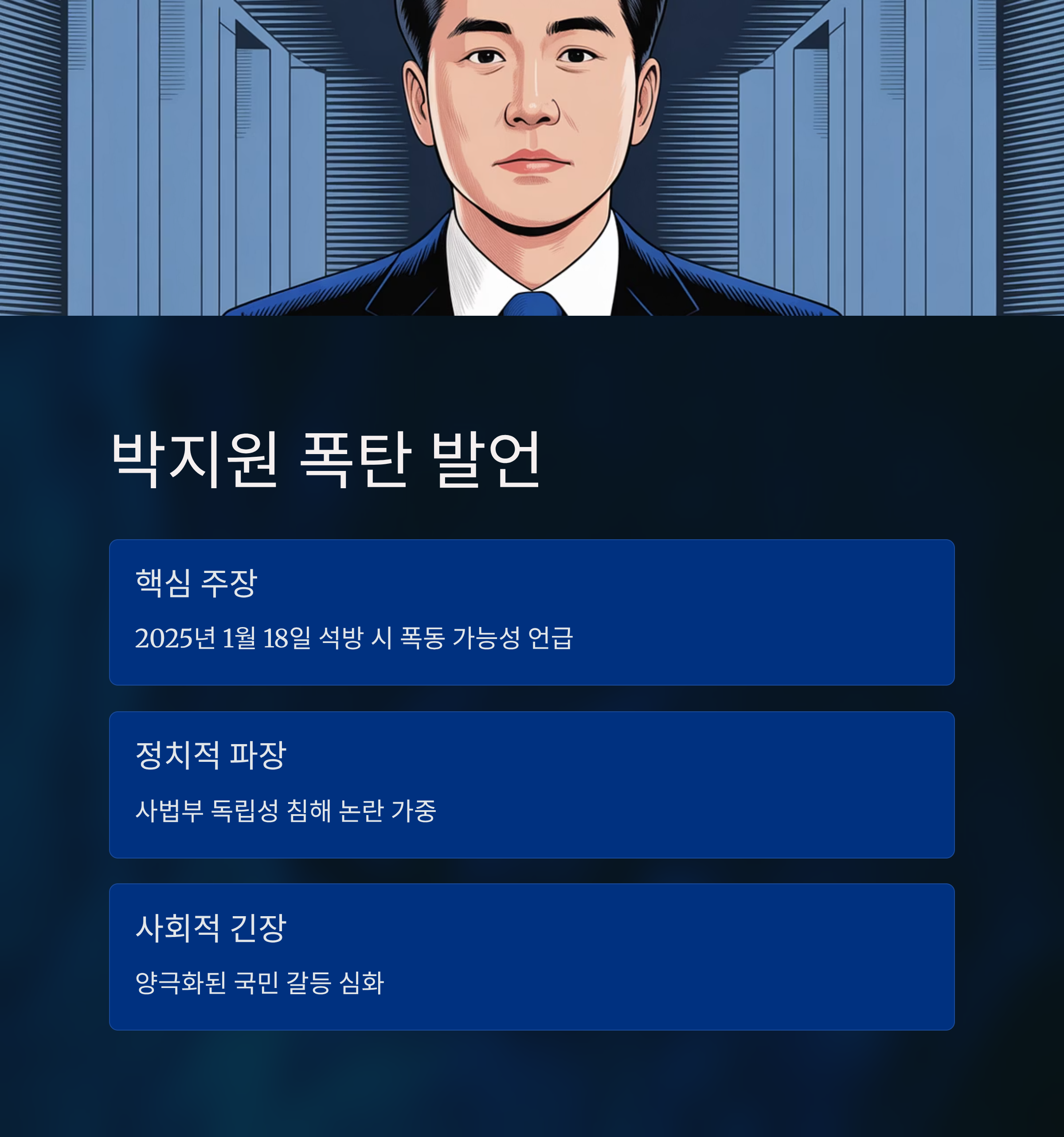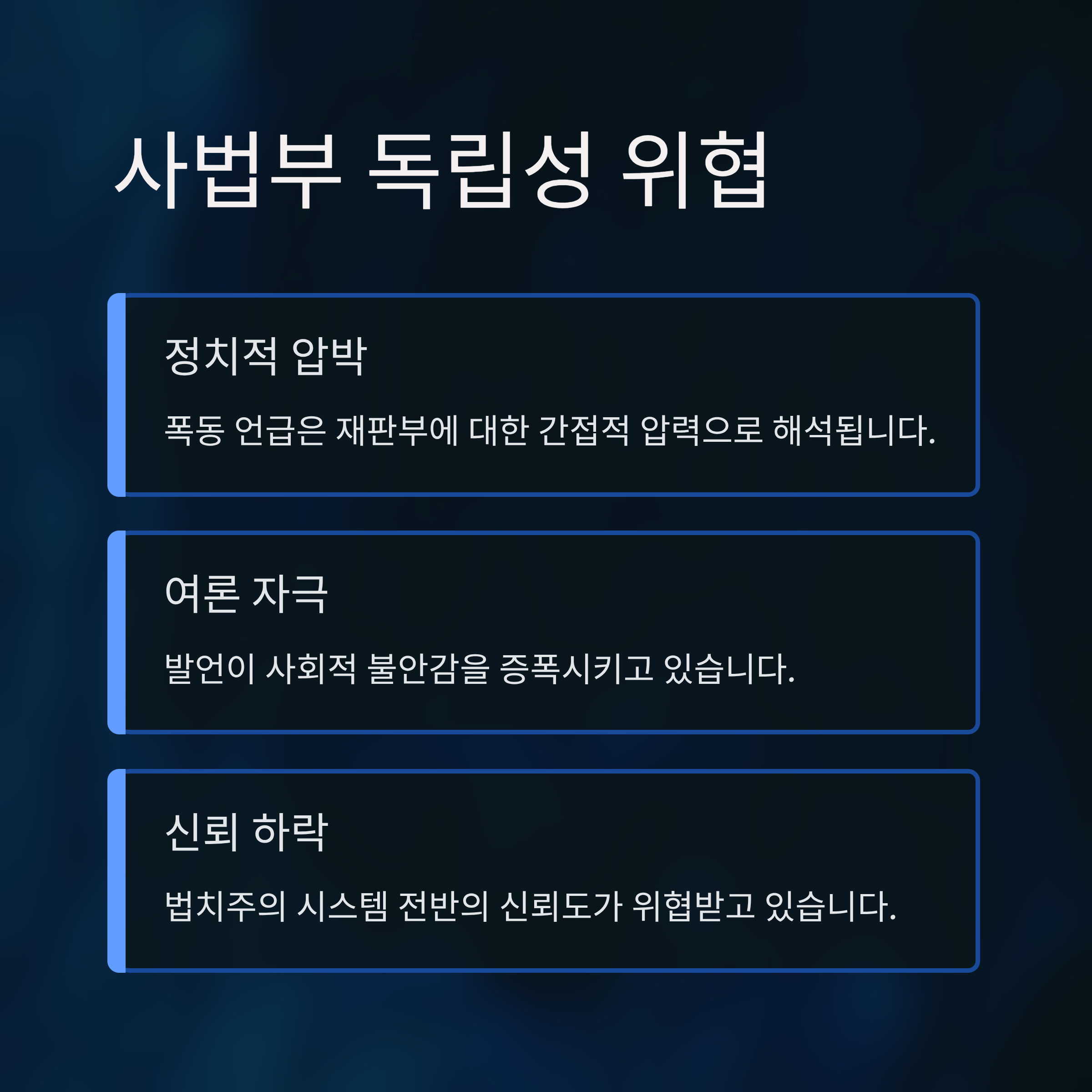 박지원 전 의원의 발언에서 내포된 '폭동 가능성' 언급은 법적 절차와는 별개로, 재판부 판결에 대한 정치적 압박으로 비춰질 여지가 큽니다. 이런 발언이 여론을 자극하거나 재판 결과에 영향을 미치지 않도록, 사법부는 독립성과 신뢰를 재확인시켜야 할 필요가 있습니다. 정치적 발언과 사법부 간의 긴장 관계가 극대화되면, 법치주의 시스템 전반에 신뢰 하락을 초래할 수 있습니다.