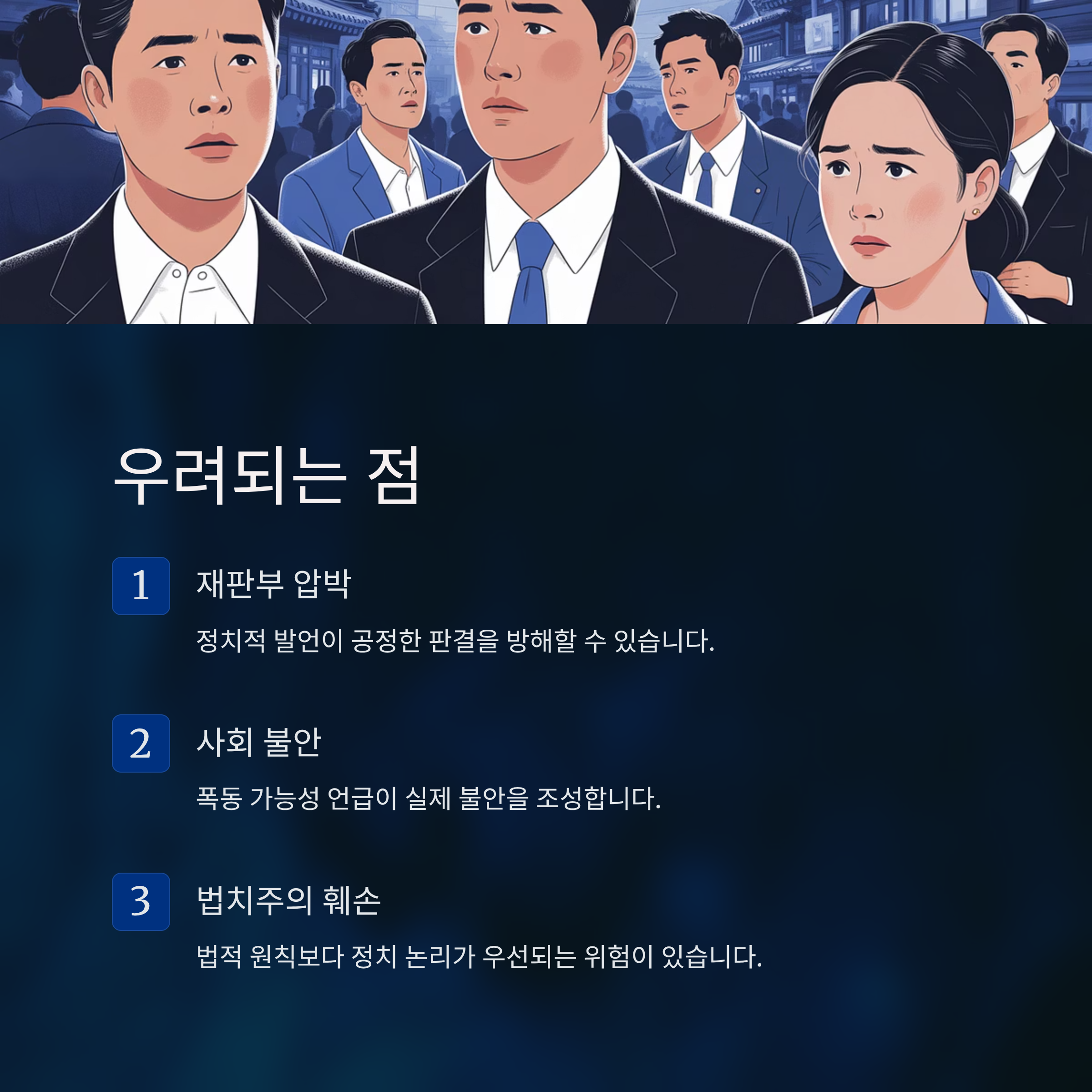 | A. 그의 발언이 재판부에 대한 간접적인 압력으로 해석될 여지가 있기 때문입니다. 이는 사법부의 독립성을 위협할 수 있다는 우려가 제기되었습니다. |