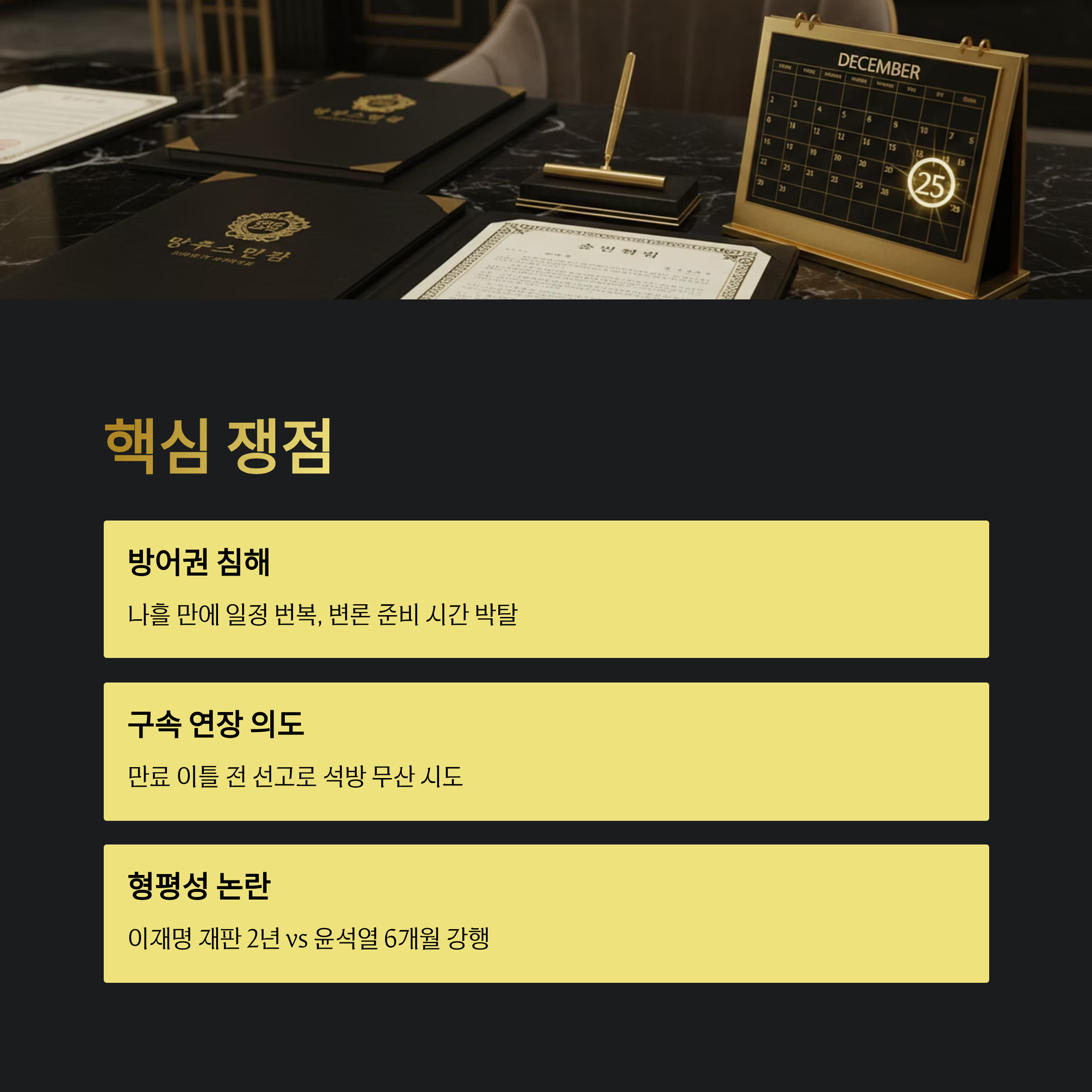 | 핵심 쟁점 | 구속 만료 전 선고 강행, 피고인 방어권 침해, 이재명 재판과의 형평성 문제 |