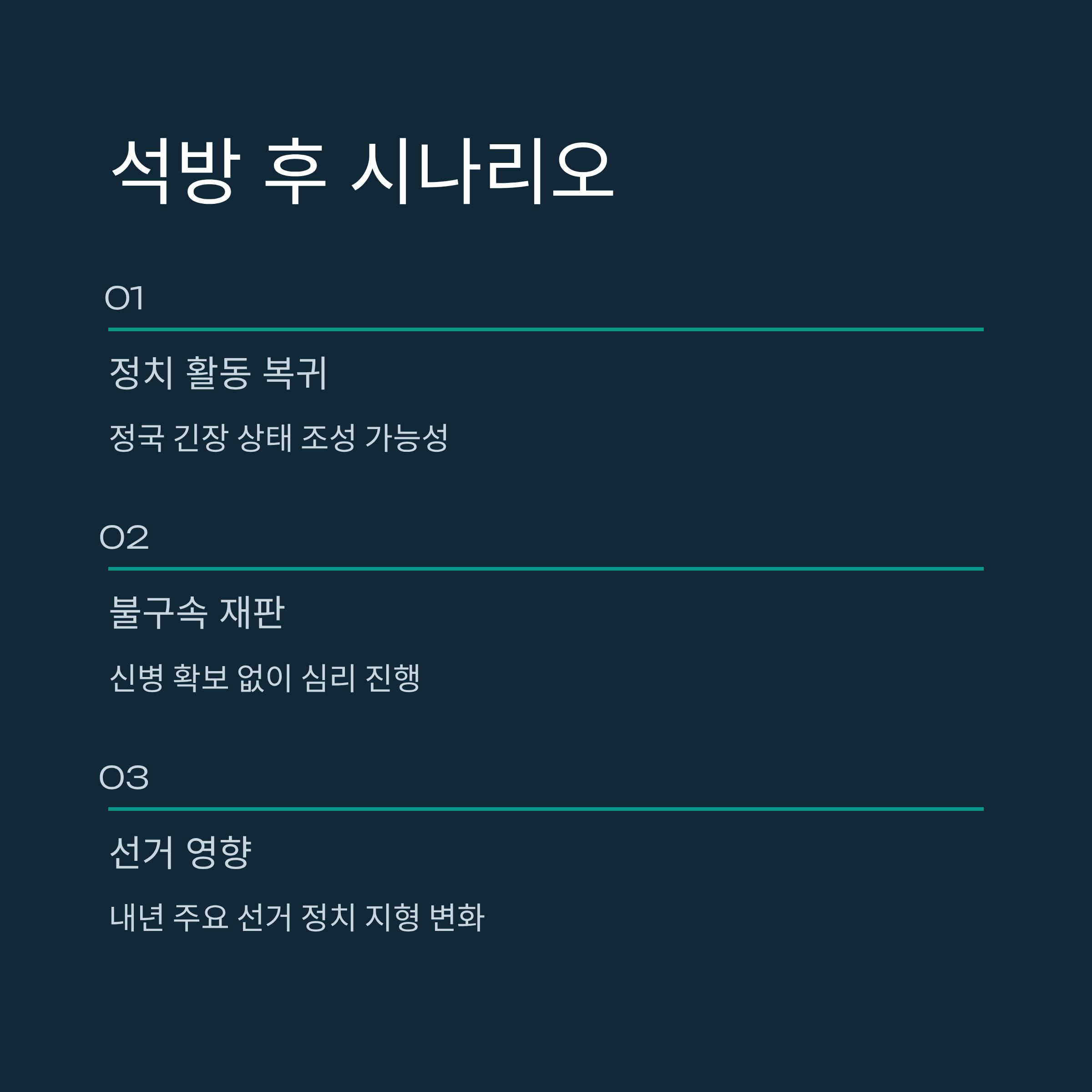 또한, 석방 가능성이 높아지면서 정치권 내부와 국민 사이에서 찬반 논란이 격화될 여지가 있습니다. 윤 전 대통령 지지 세력은 석방이 정의 구현이라고 주장하며 여론몰이를 펼칠 가능성이 있으며, 반대 진영은 법의 신뢰성 훼손을 비판할 것으로 예상됩니다.