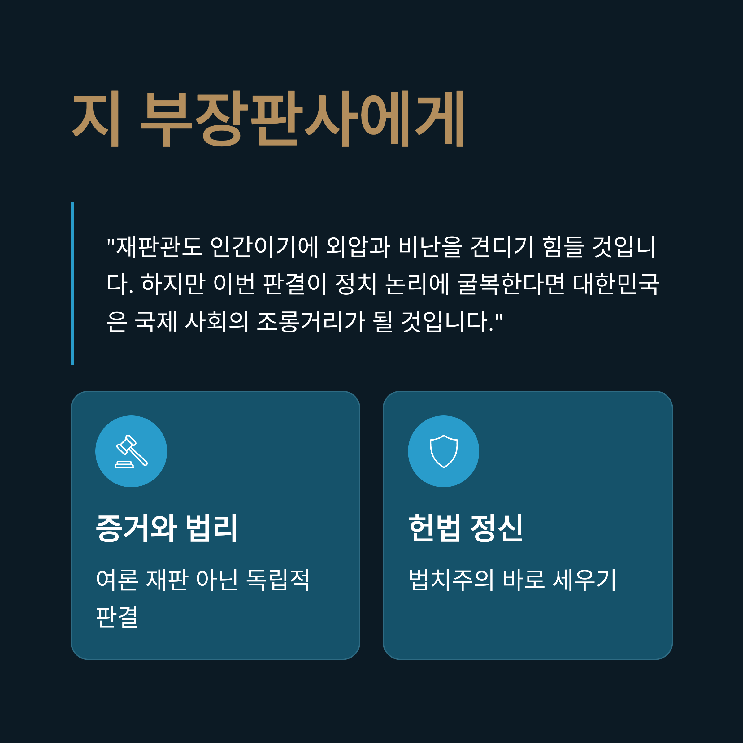 분석의 마지막 초점은 지(Ji) 부장판사(재판장)의 역할론입니다. 현재 입법과 행정이 이재명 정부와 민주당에 의해 장악된 상황에서, 사법부는 자유민주주의를 지킬 '마지막 보루'로 여겨지고 있습니다. 성명서는 재판관 역시 인간이기에 엄청난 외압과 비난을 견디기 힘들 것이라는 점에 공감하면서도, 만약 이번 재판이 정치 논리에 굴복한다면 대한민국은 국제 사회의 조롱거리가 될 것이라고 경고합니다. 즉, 이번 선고는 법관 개인의 양심을 넘어 대한민국의 헌법 정신이 살아있는지를 증명하는 시험대입니다. 지지자들은 재판부가 여론 재판이 아닌, 오직 증거와 법리에 입각한 독립적인 판결을 통해 무너진 법치를 바로 세워주기를 강력히 촉구하고 있습니다.