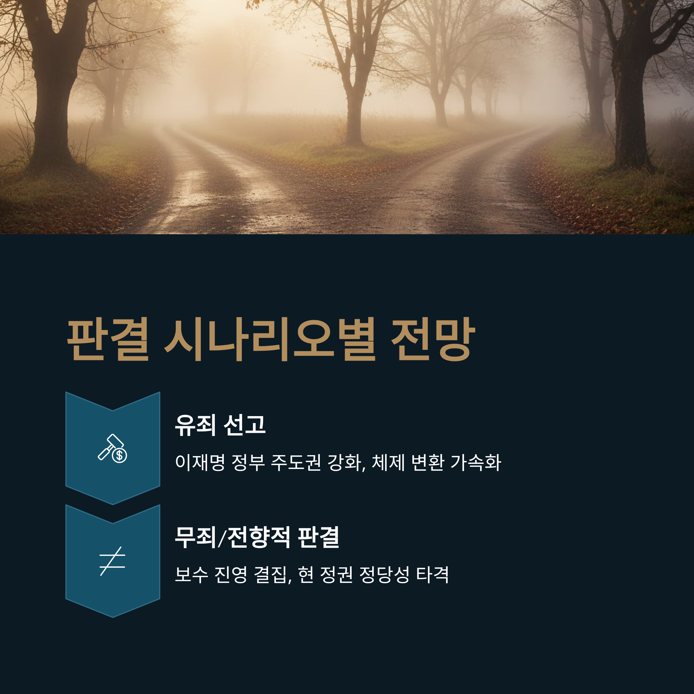 | A. 유죄가 선고될 경우 이재명 정부와 민주당의 주도권이 더욱 강화되어 현 체제 변환 시도가 가속화될 것으로 예상됩니다. 반면, 무죄나 전향적인 판결이 나올 경우 보수 진영의 결집과 함께 현 정권의 정당성에 타격을 주며 정국이 새로운 국면을 맞이할 것으로 보입니다. |