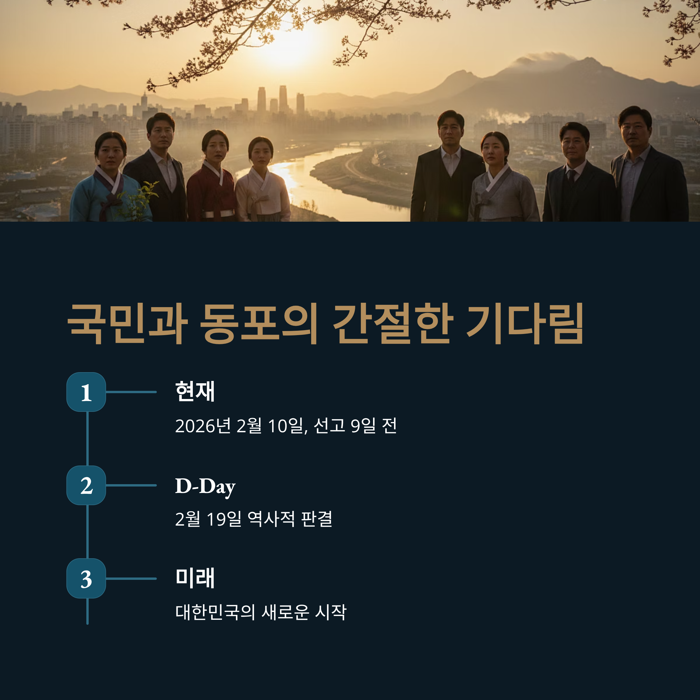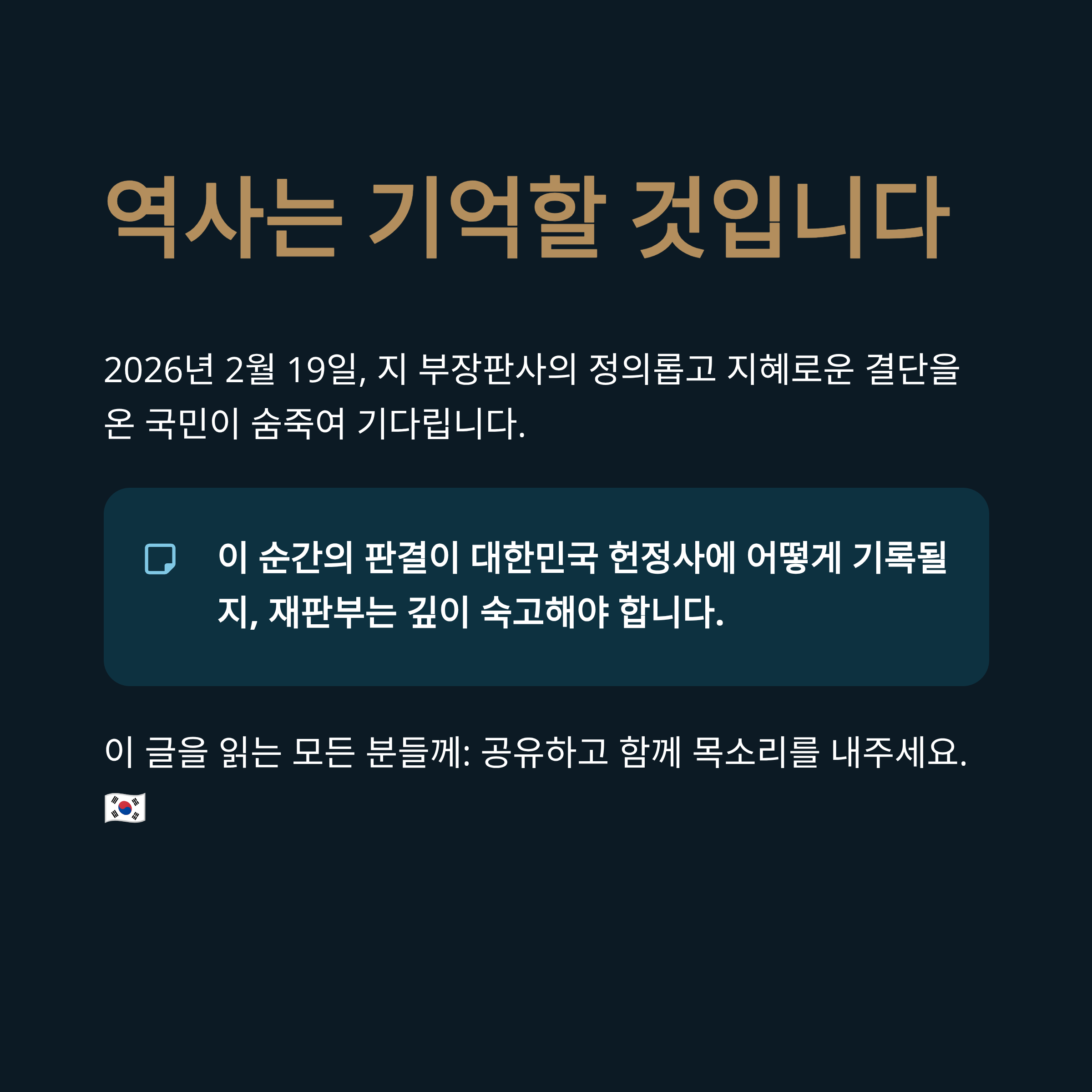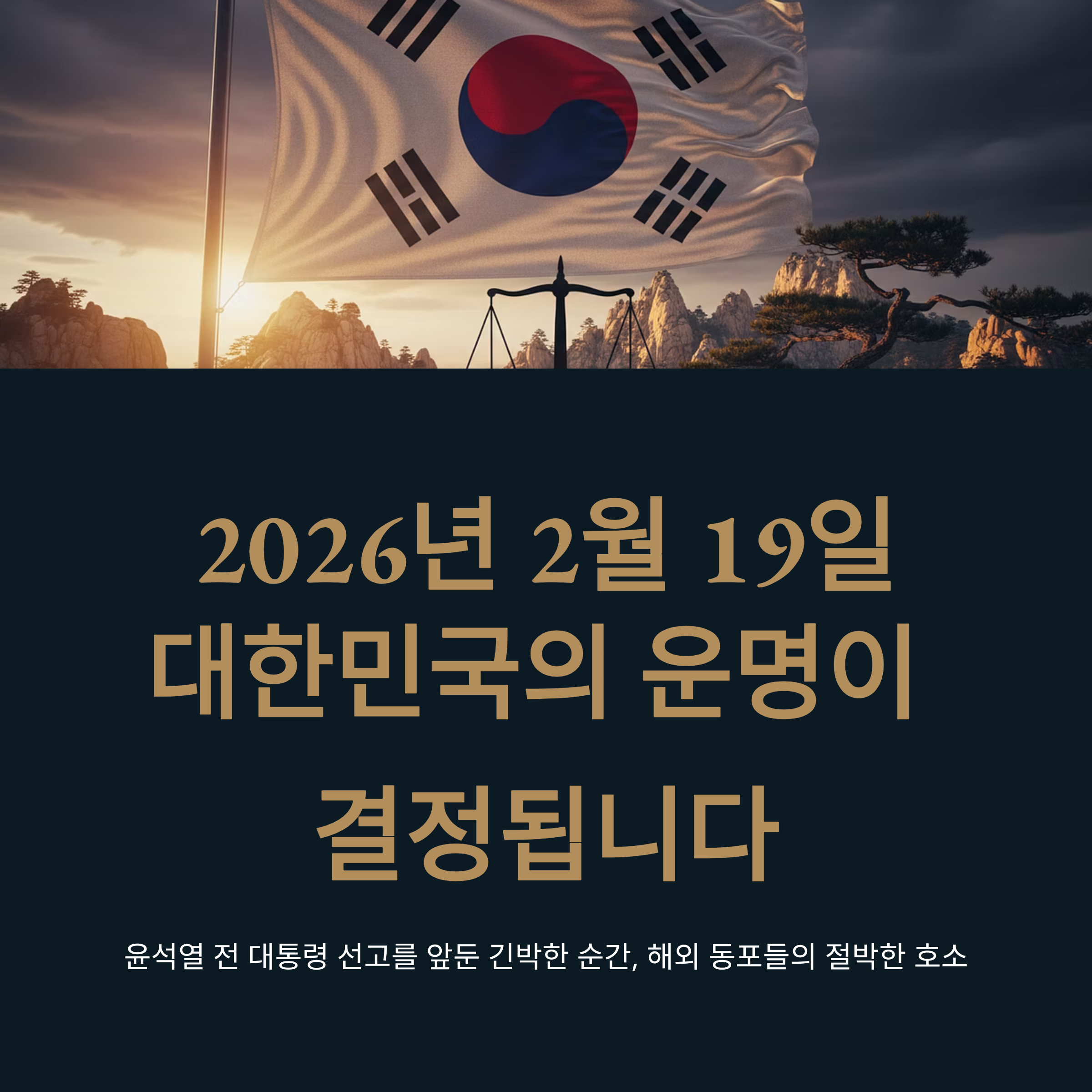 오는 2월 19일 예정된 윤석열 전 대통령에 대한 선고 공판은 2026년 대한민국 정치사의 가장 중요한 사건이 될 것입니다. 이재명 정부 출범 이후 지속된 정치적 갈등과 계엄 정국의 후폭풍 속에서, 사법부의 판단은 국가의 향방을 결정지을 것입니다. 해외 동포들의 절박한 성명서는 현재 대한민국이 직면한 위기가 단순한 정권 교체의 차원을 넘어, 자유민주주의 체제의 존립과 직결되어 있음을 시사합니다. 언론의 편향성과 정치적 외압 속에서도 사법부가 중심을 잡아야 한다는 목소리는 그 어느 때보다 높습니다. 만약 사법부마저 정치적 흐름에 편승한다면, 대한민국은 '암흑기'로 접어들 것이라는 경고를 엄중히 받아들여야 합니다. 지 부장판사를 비롯한 재판부는 이번 판결이 역사에 어떻게 기록될지 깊이 숙고해야 할 것입니다. 부디 이번 판결이 특정 진영의 승리가 아닌, 대한민국의 헌법 정신과 법치주의가 승리하는 계기가 되기를 바라며, 국민과 해외 동포들은 재판부의 정의롭고 지혜로운 결단을 숨죽여 기다리고 있습니다.