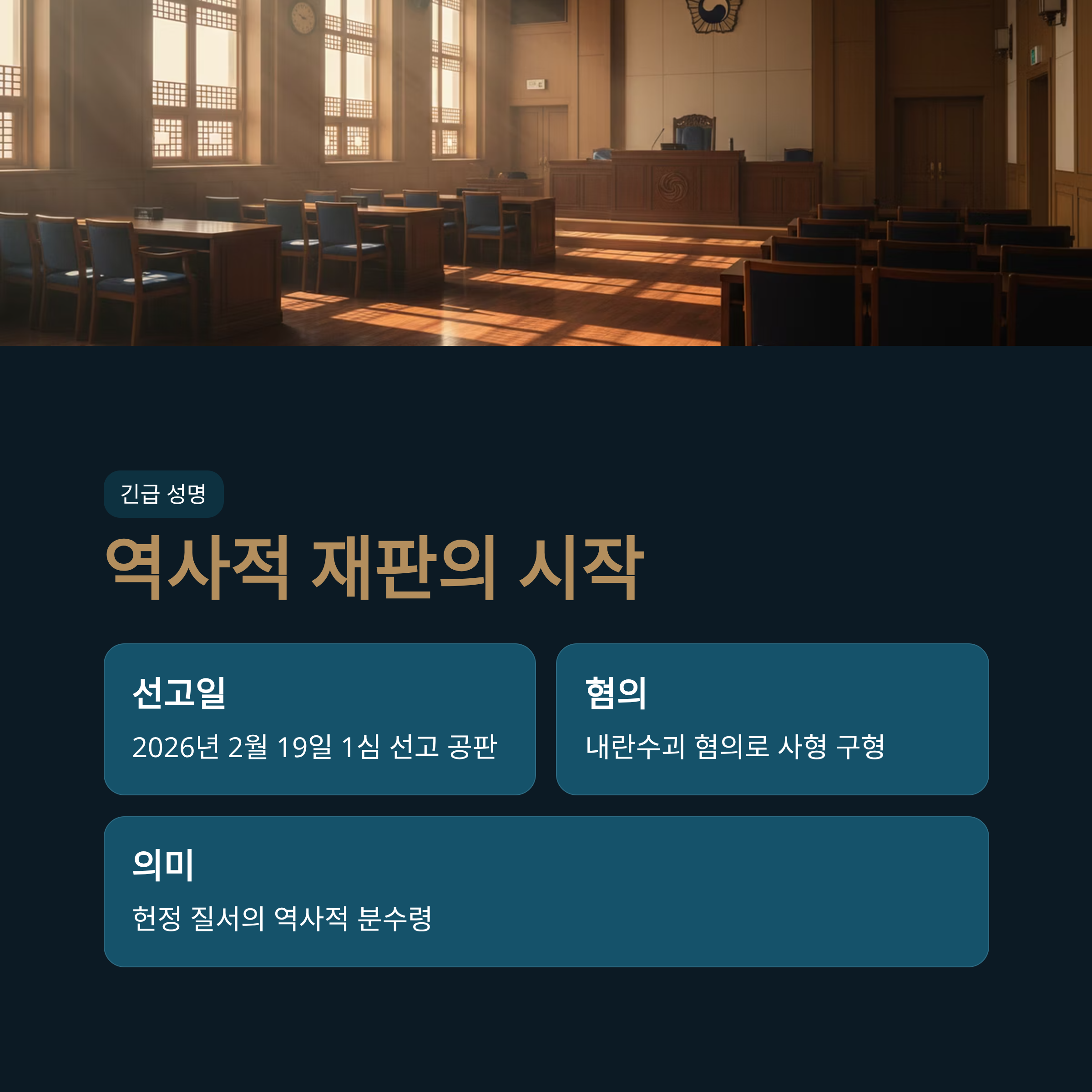 | 재판 일정 및 혐의 | 오는 2월 19일, 윤석열 전 대통령의 내란수괴 혐의 1심 선고 공판이 진행됩니다. 이는 대한민국 헌정사상 전직 대통령에 대한 가장 무거운 구형 중 하나입니다. |