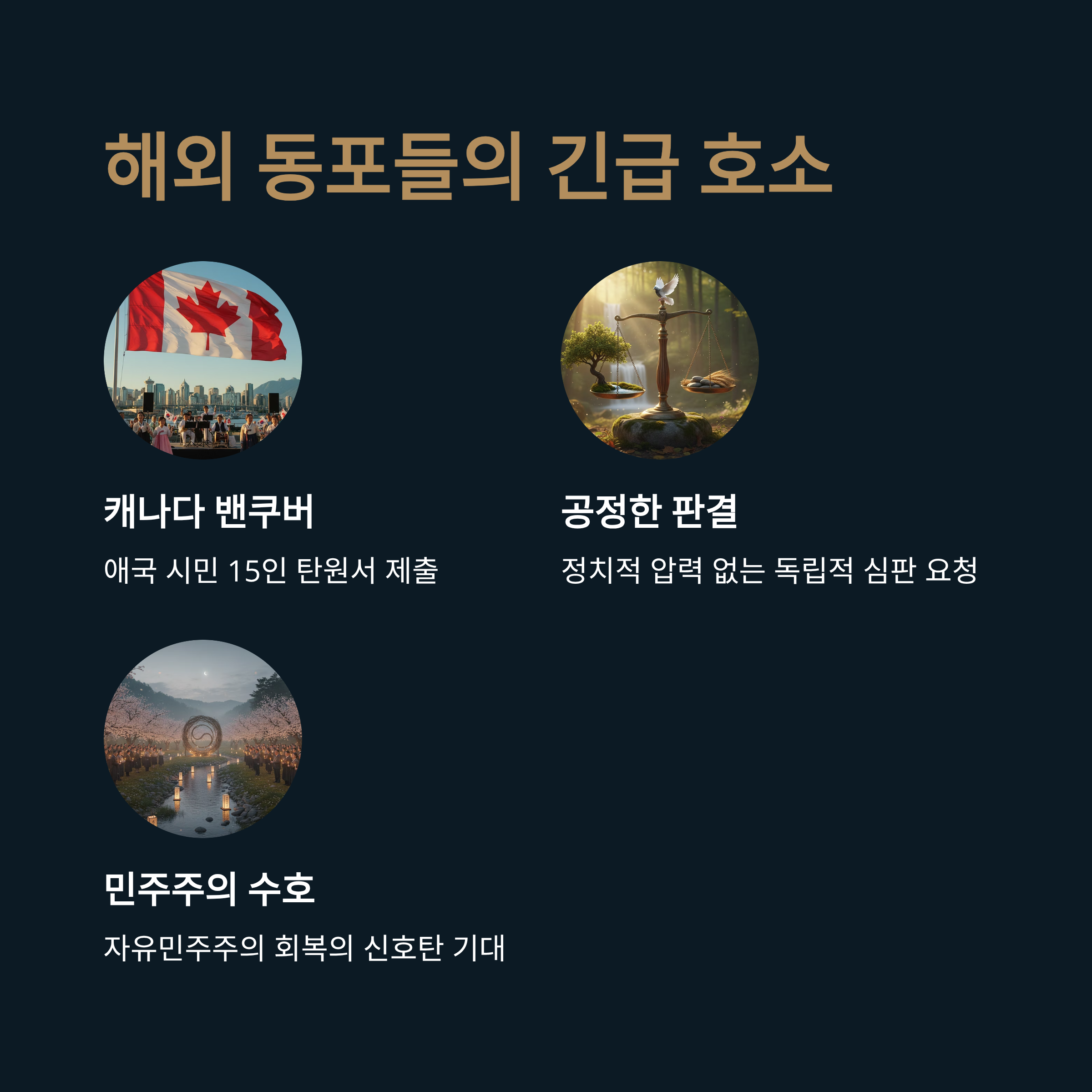 | 해외 동포 긴급 성명 | 캐나다 밴쿠버 애국 시민 15인을 포함한 해외 동포들이 지 부장판사에게 탄원서를 제출, 정치적 압력에 흔들리지 않는 공정한 판결을 간곡히 요청했습니다. |