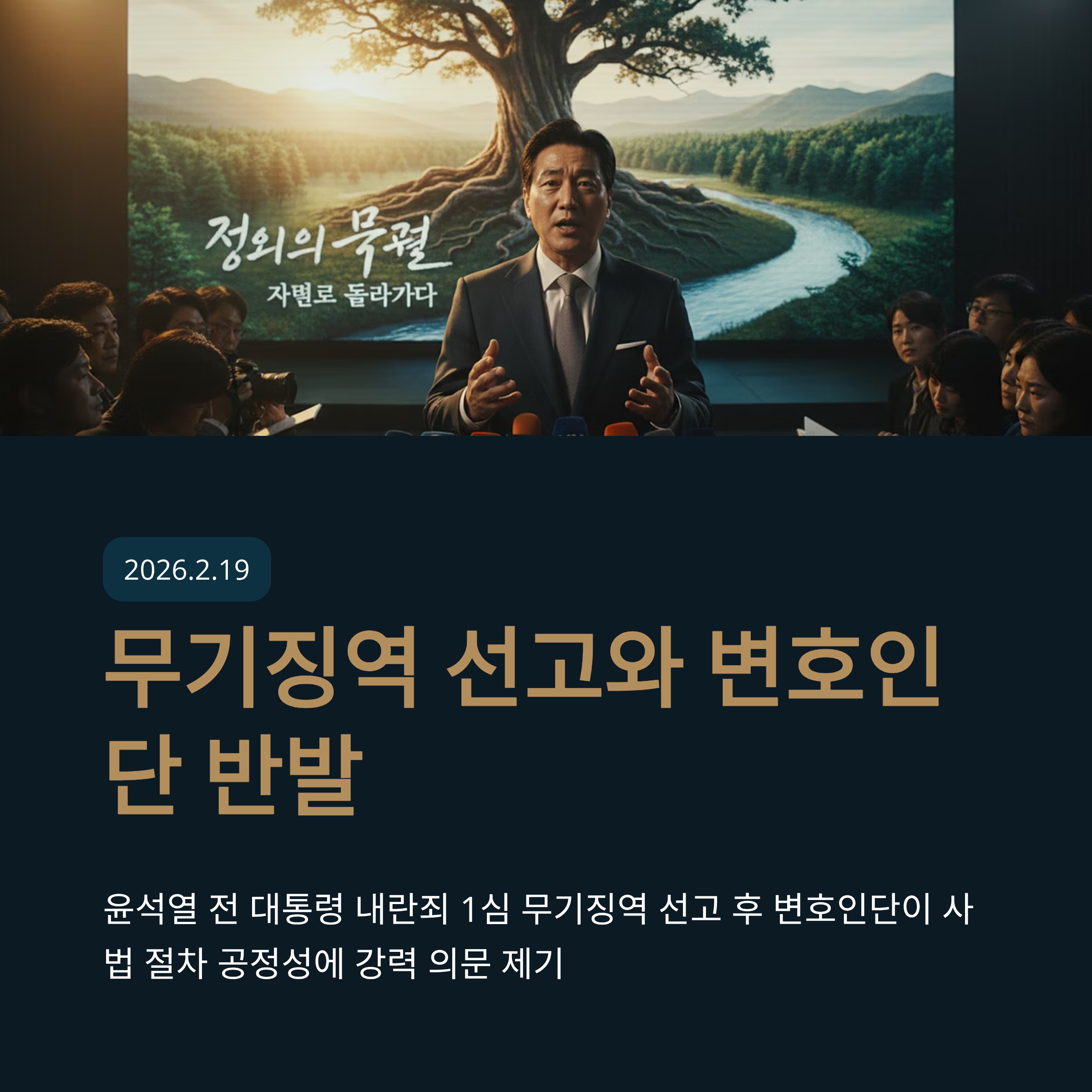 2026년 2월 19일, 대한민국 헌정사에 유례없는 판결이 내려졌습니다. 법원이 윤석열 전 대통령의 내란 수괴 혐의에 대해 무기징역을 선고하자, 변호인단은 즉각 강력히 반발하며 사법 절차의 공정성에 의문을 제기했습니다. 특히 윤갑근 변호사는 이번 판결을 "정해진 결론에 맞춘 정치적 쇼"라고 규정하며, 향후 항소심을 포함한 일체의 형사 소송 절차를 거부하는 '재판 보이콧' 가능성까지 시사했습니다. 본 글에서는 1심 판결의 주요 쟁점인 증거 채택의 문제점, 절차적 하자, 그리고 변호인단이 주장하는 사법부의 정치적 종속 논란을 심층적으로 분석합니다.