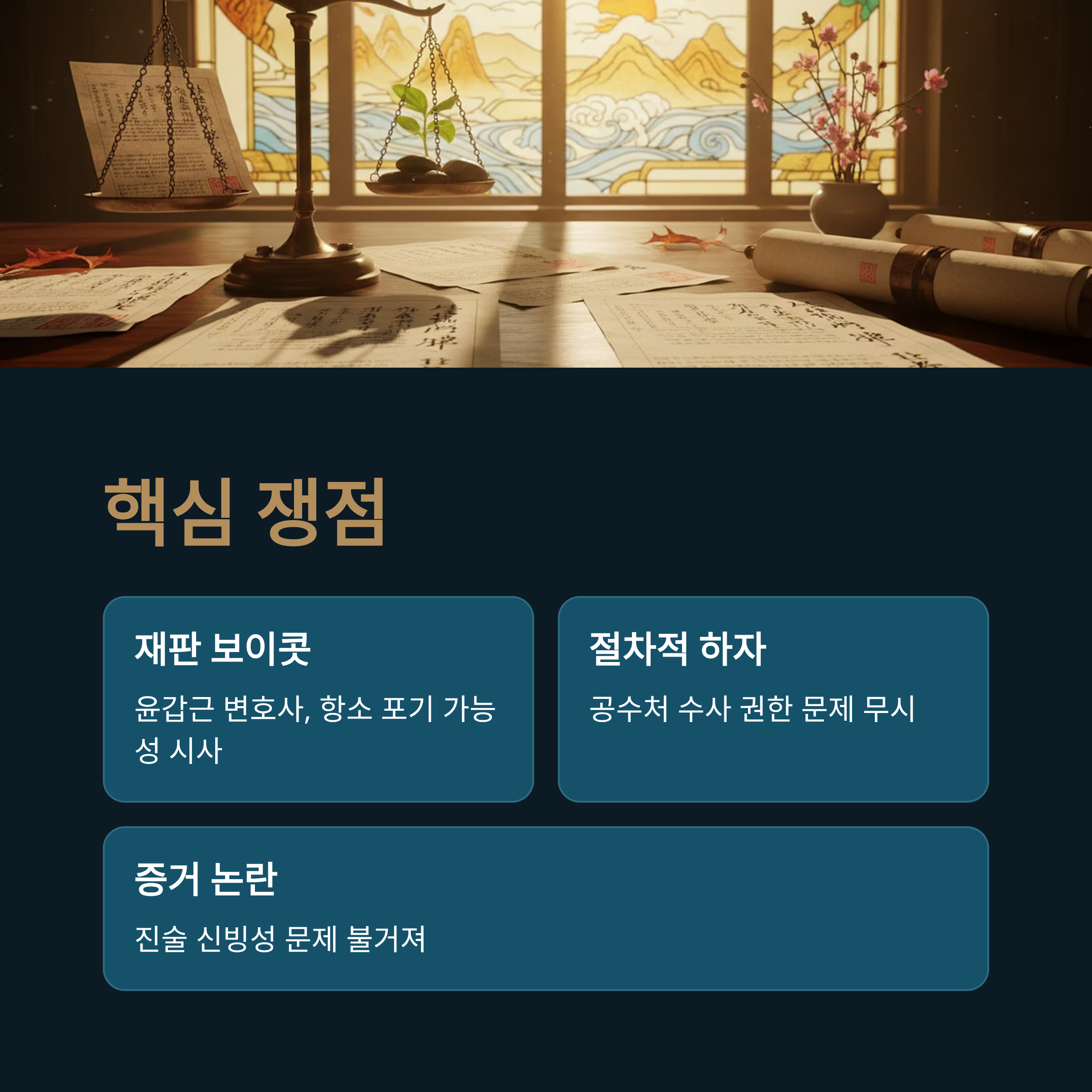 윤갑근 변호사를 비롯한 변호인단이 '재판 보이콧'이라는 초강수를 둔 배경에는 사법부에 대한 깊은 불신이 자리 잡고 있습니다. 변호인단은 이번 재판을 "선동된 여론과 정적을 숙청하려는 정치 권력에 사법부가 무릎 꿇은 결과"라고 규정했습니다. 재판장이 선고 당일 경직된 표정으로 판결문을 낭독한 모습이나, 피고인 측의 방어권 행사가 대부분 기각된 점은 재판부가 외부의 유무형적 압박에서 자유롭지 못했음을 방증한다는 것입니다.